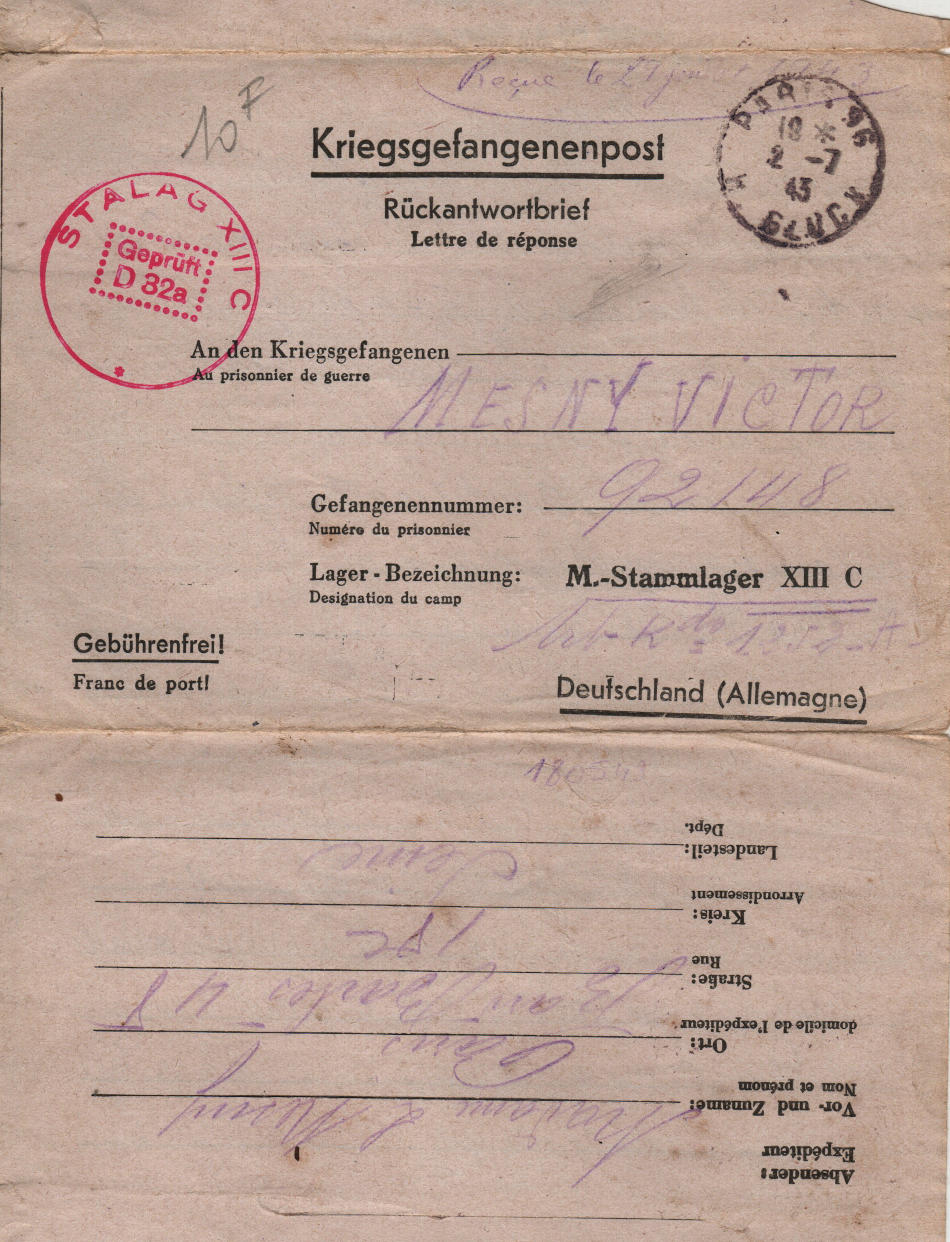 Lettera scritta il 1.7.1943 a Parigi (Francia) e spedita al campo di prigionia