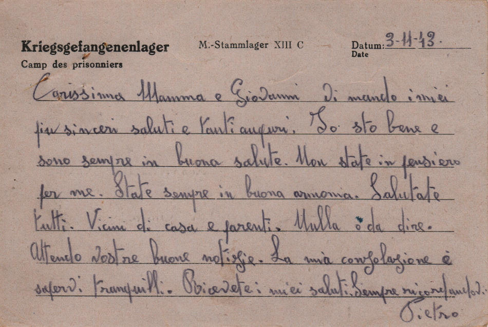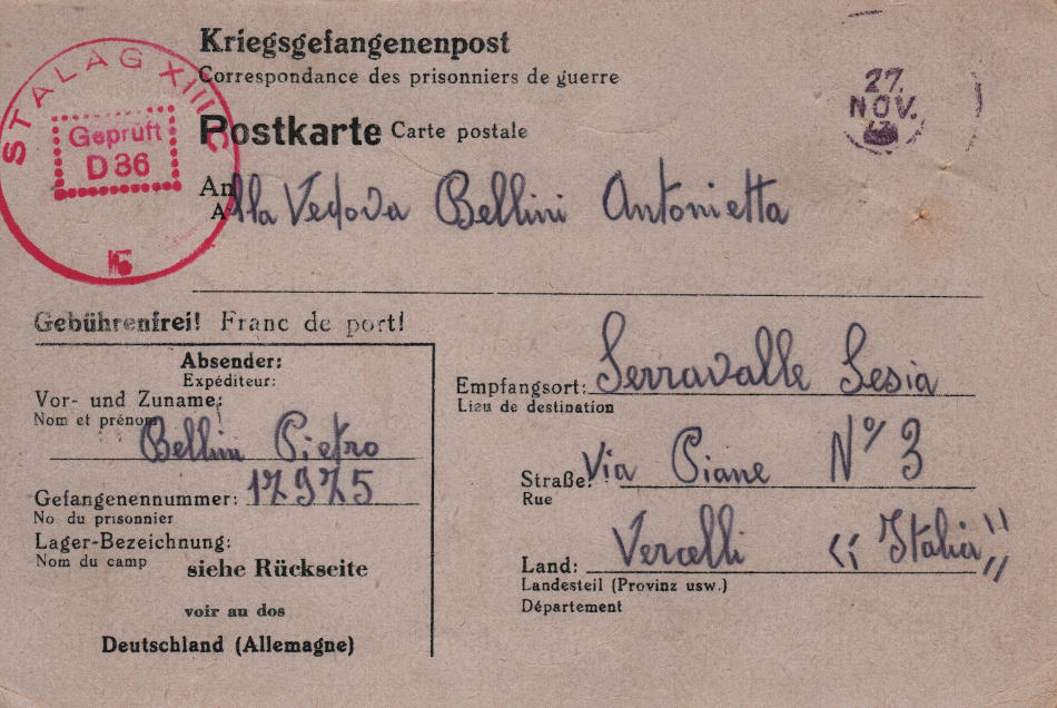 Cartolina scritta il 3.11.1943 nel campo di prigionia e spedita a Vercelli (Italia)