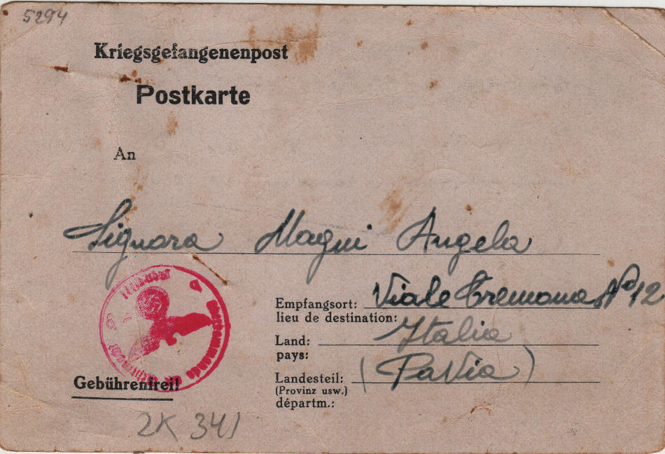 Cartolina precompilata scritta il 7.11.1943 nel campo di prigionia e spedita a Pavia in Italia