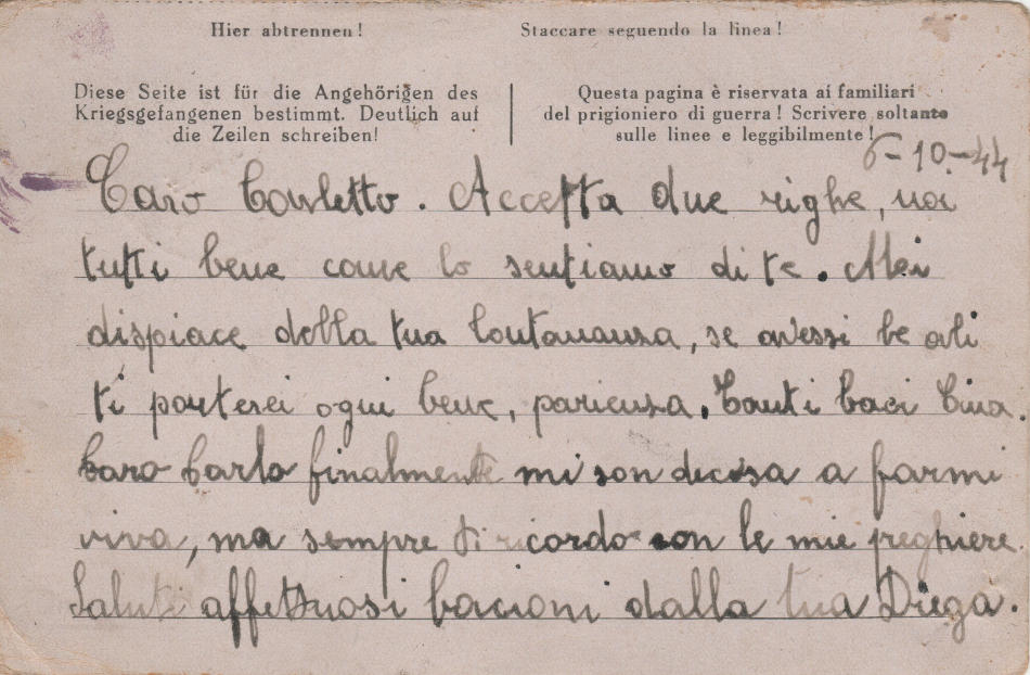 Cartolina scritta il 6.10.1944 a Meda (provincia di Milano) in Italia e spedita al campo di prigionia