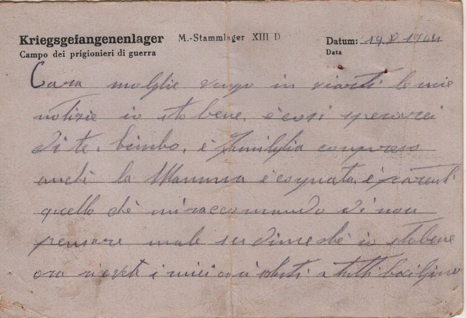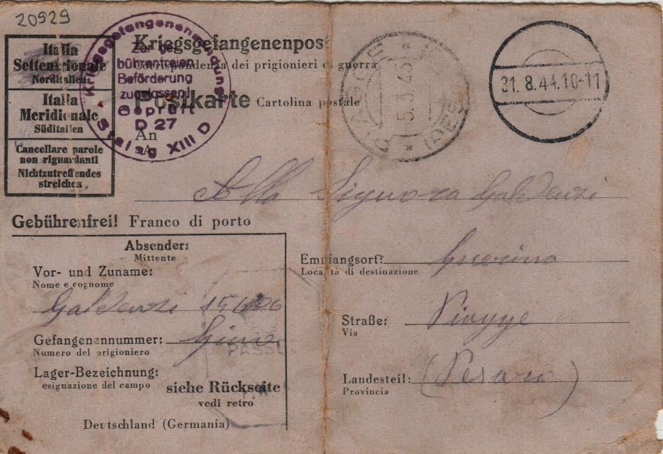 Cartolina scritta il 19.8.1944 nel campo di prigionia e spedita a Piagge (provincia di Pesaro) in Italia