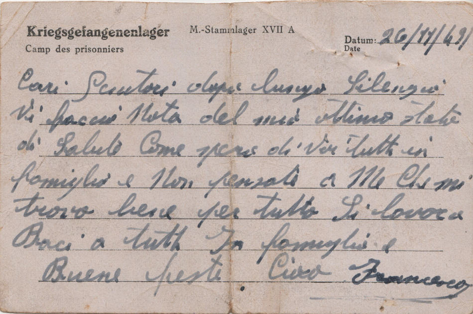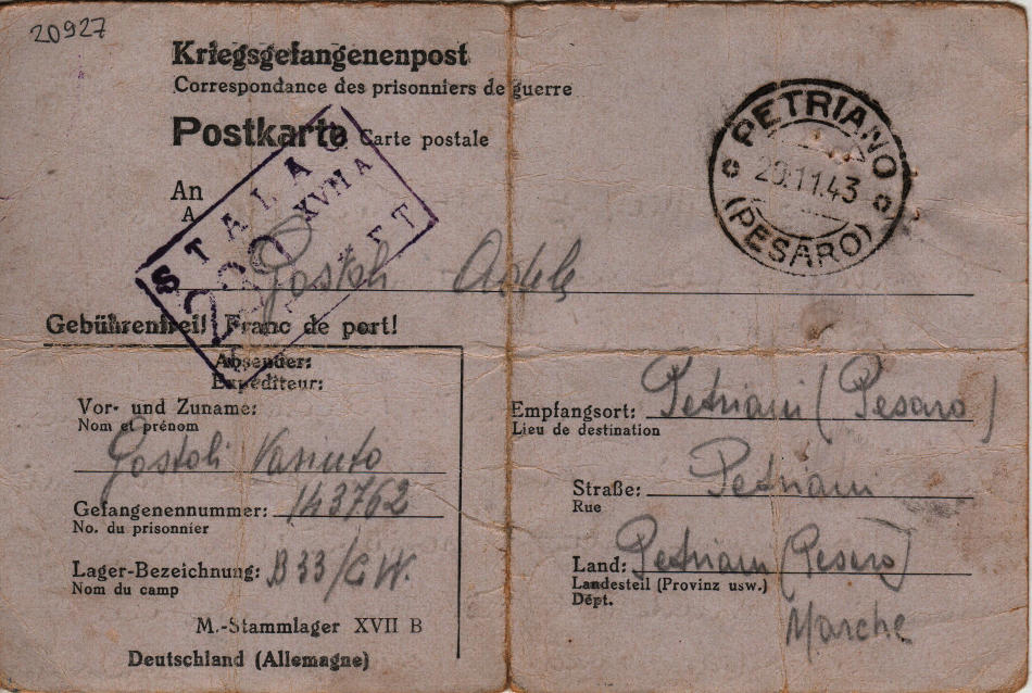 Cartolina scritta il 26.11.1943 nel campo di prigionia e spedita a Petriano, provincia di Pesaro, in Italia