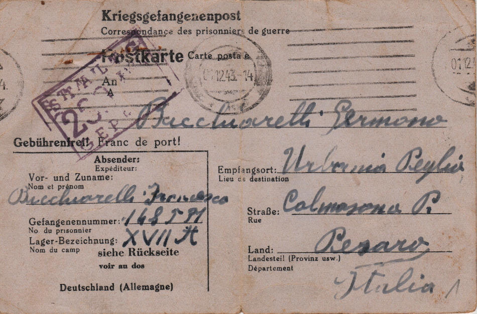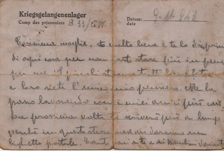 Cartolina scritta il 9.11.1943 nel campo di prigionia e spedita a Urbania Peglio, provincia di Pesaro, in Italia