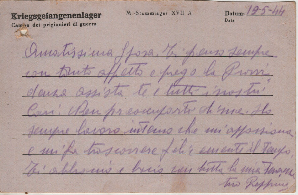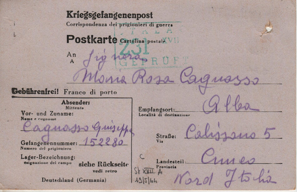 Cartolina scritta il 19.5.1944 nel campo di prigionia e spedita ad Alba (provincia di Cuneo) in Italia