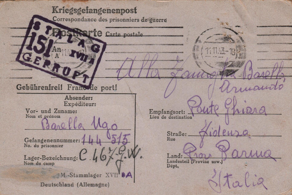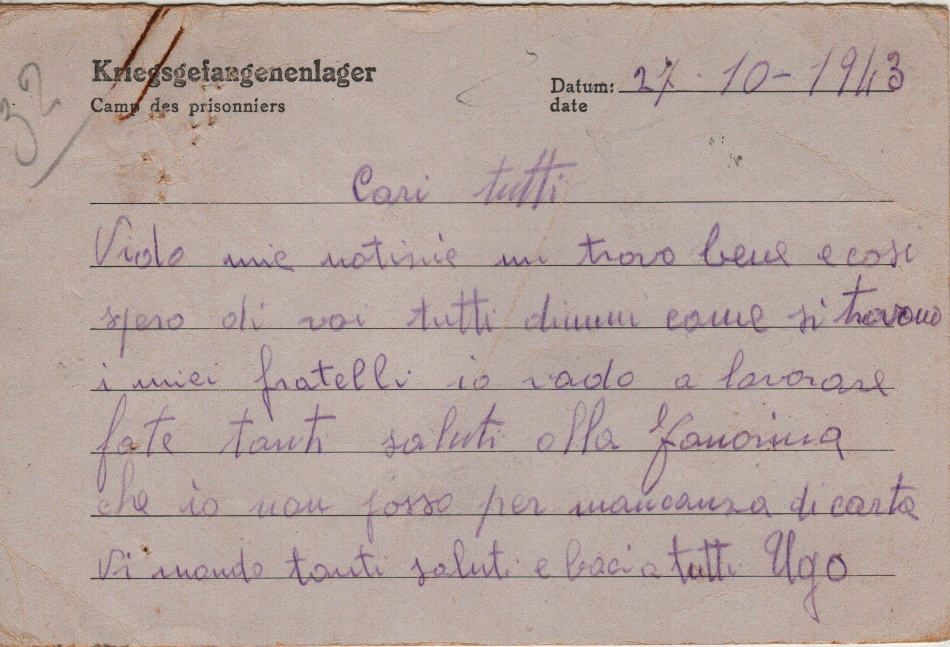Cartolina scritta il 27.10.1943 nel campo di prigionia e spedita a Ponte Ghiara, comune di Fidenza (provincia di Parma) in Italia