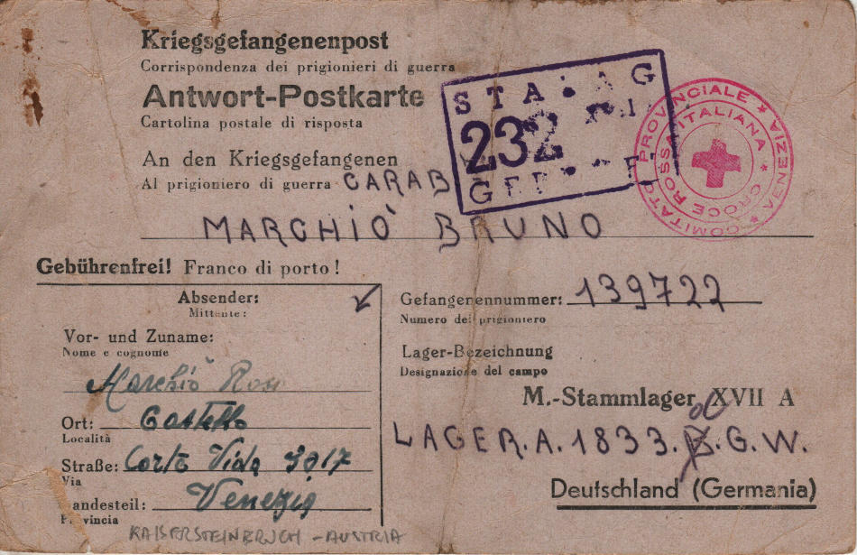 Cartolina scritta il 10.6.1944 a Venezia in Italia e spedita al campo di prigionia