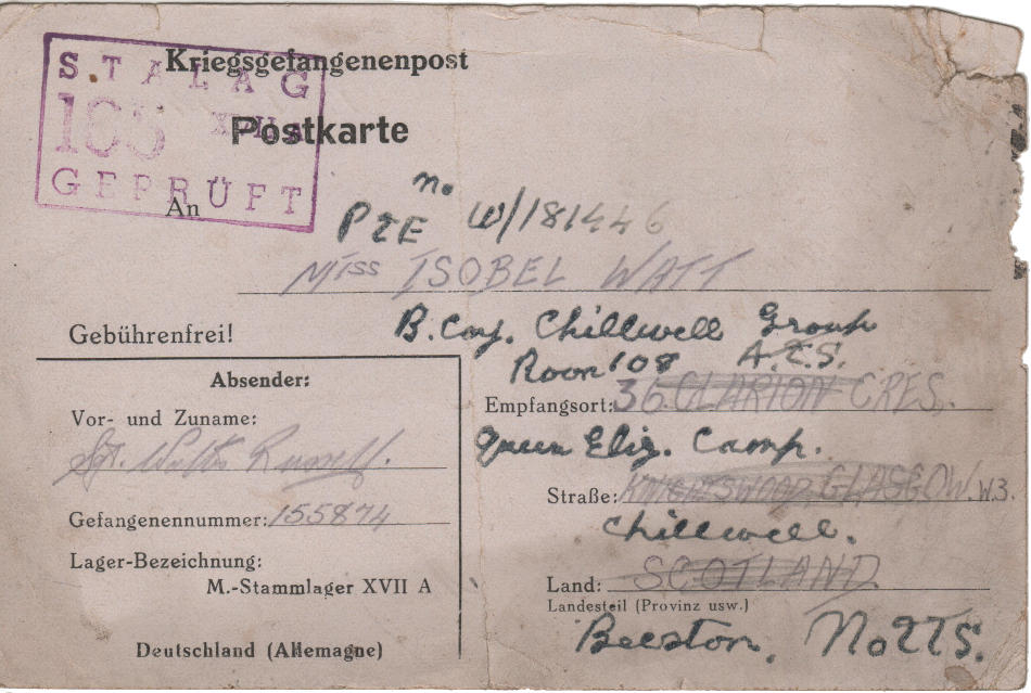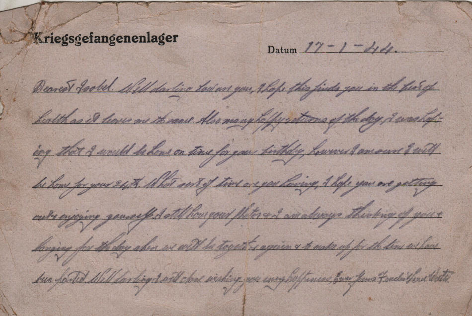 Cartolina scritta il 17.1.1944 nel campo di prigionia e spedita a Knightswood (Glasgow) ma rinviata a Beeston, Nottinghamshare (Notts) nel Regno Unito