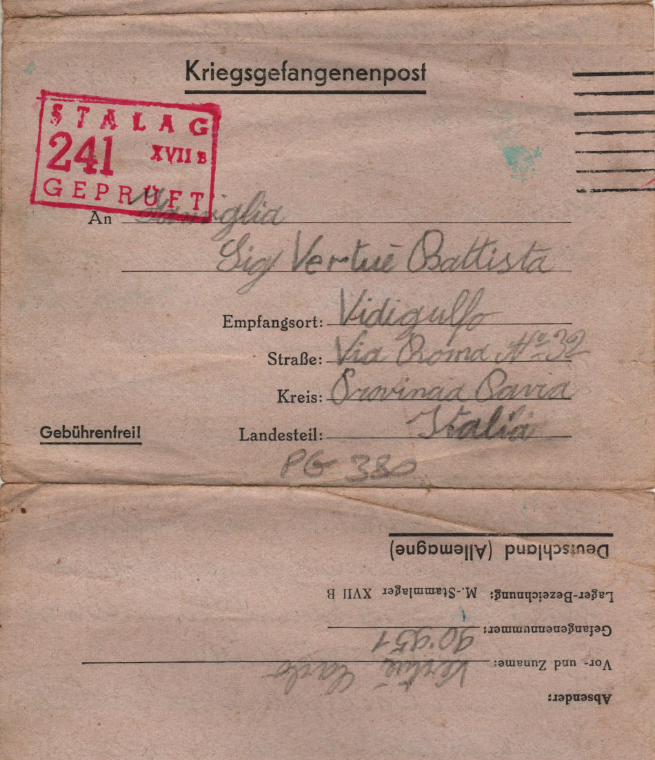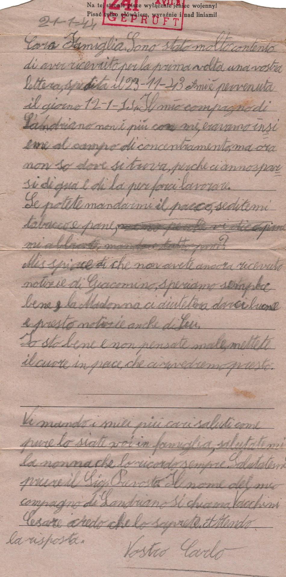 Lettera scritta il 21.1.1944 nel campo di prigionia e spedita a Vidigulfo, provincia di Pavia (Italia)