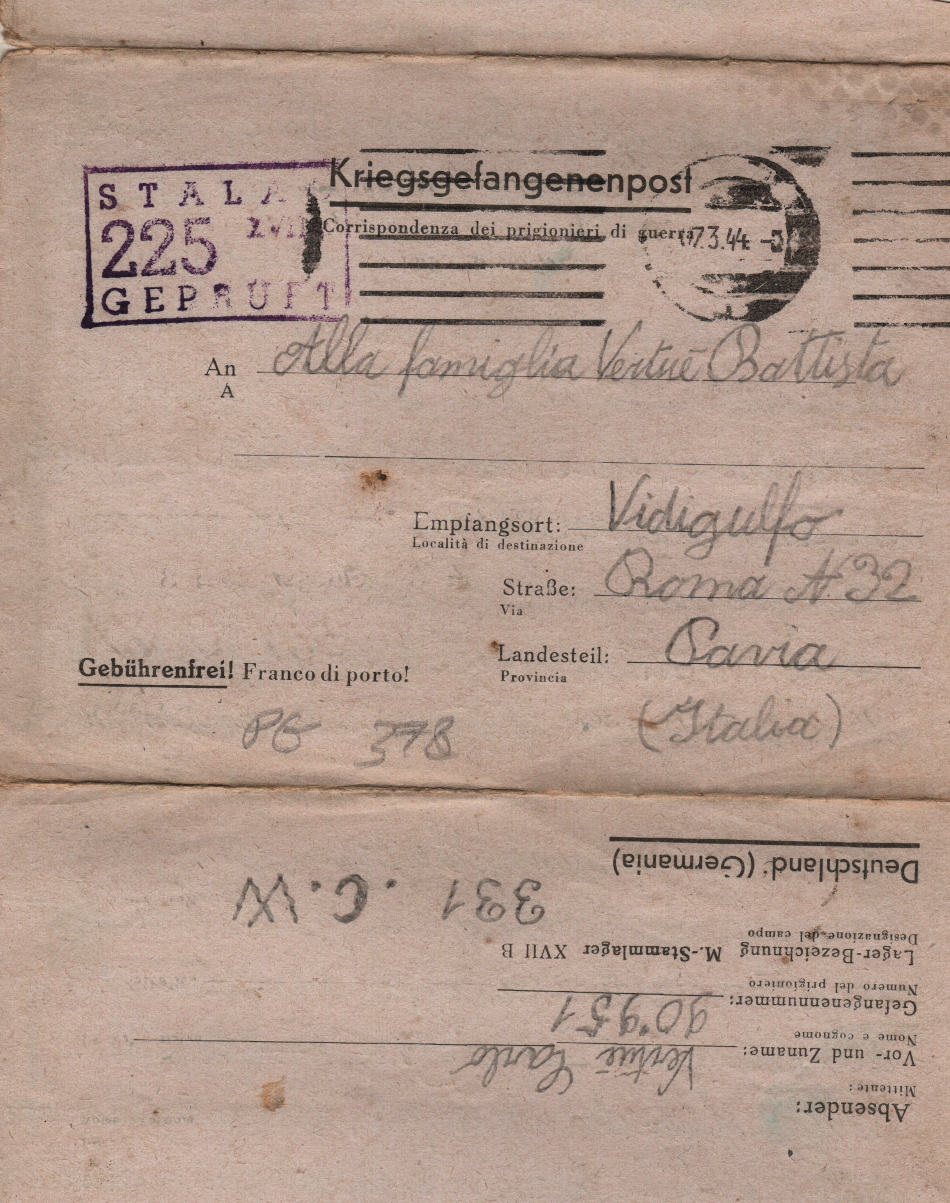 Lettera scritta il 15.2.1944 nel campo di prigionia e spedita a Vidigulfo, provincia di Pavia (Italia)