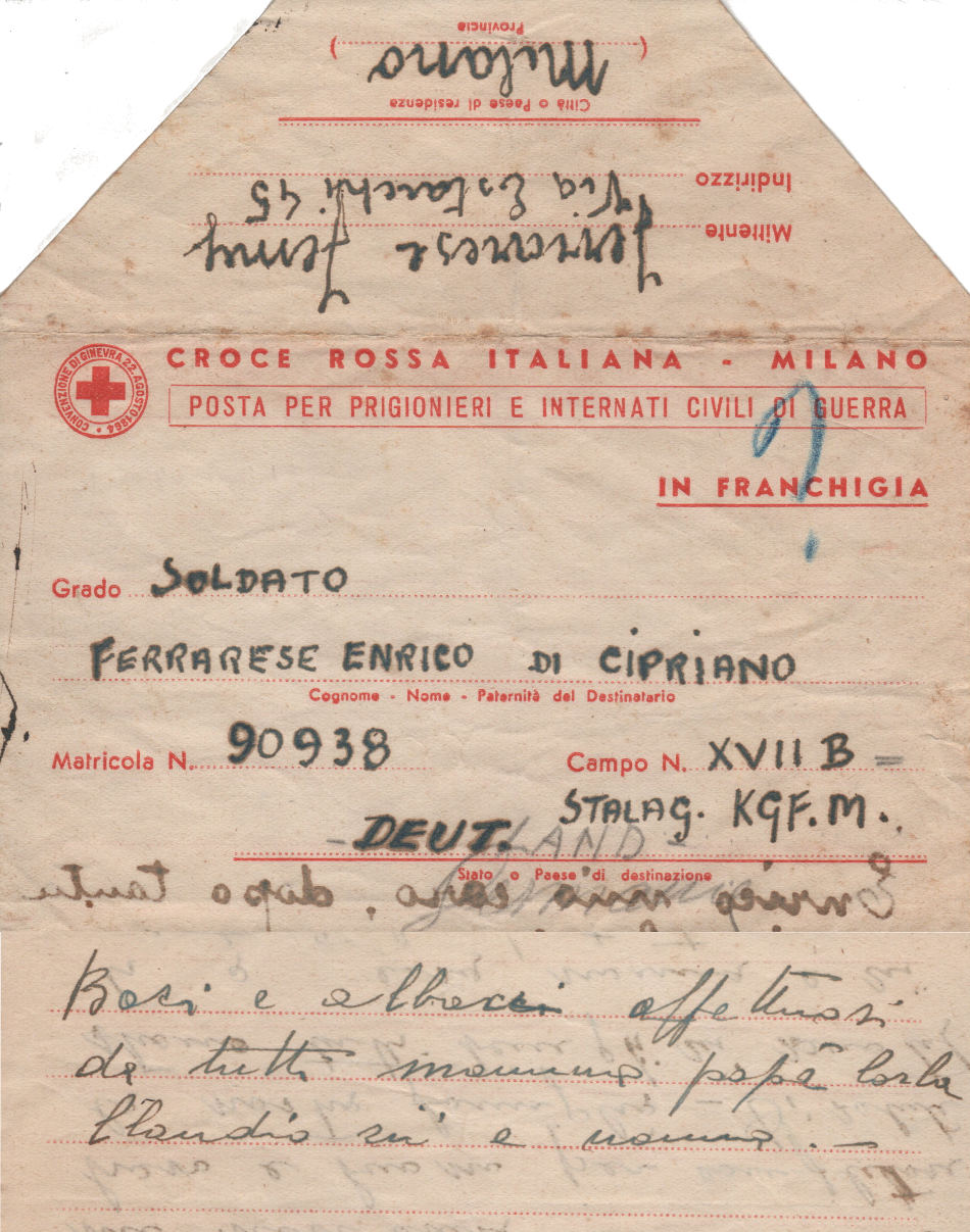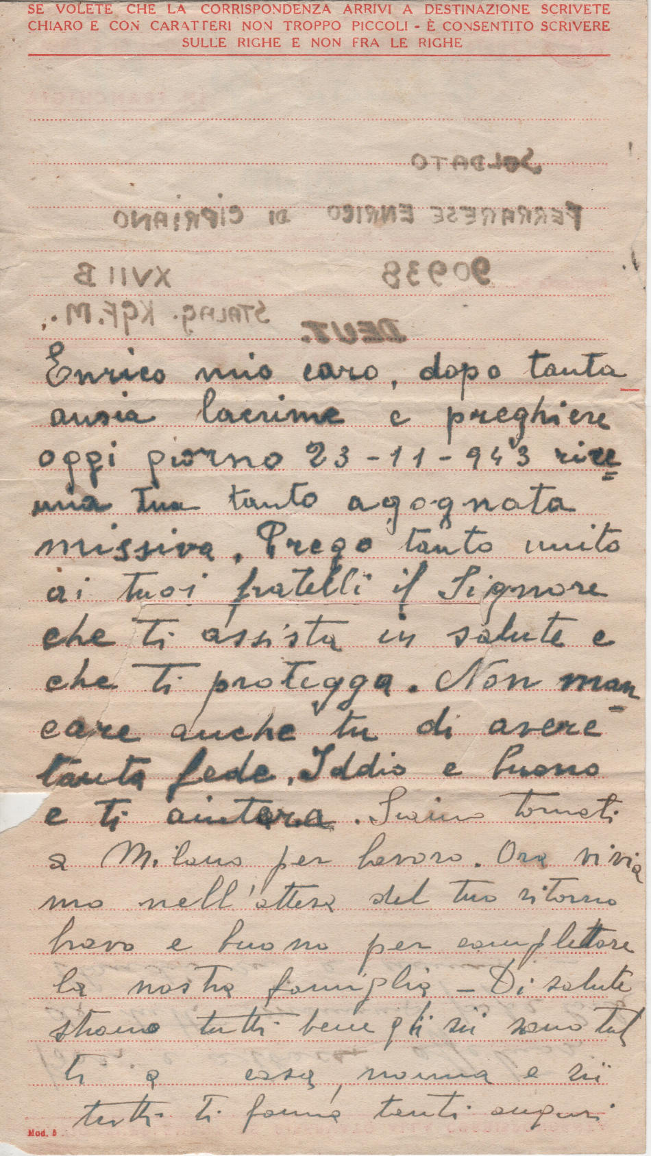 Lettera scritta il 23.11.1943 a Milano in Italia e spedita al campo di prigionia