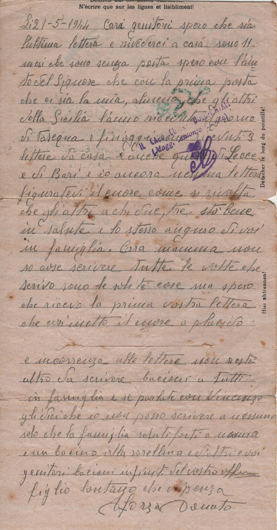 Lettera scritta il 21.5.1944 nel campo di prigionia e spedita a Martina Franca, provincia di Taranto (Italia)