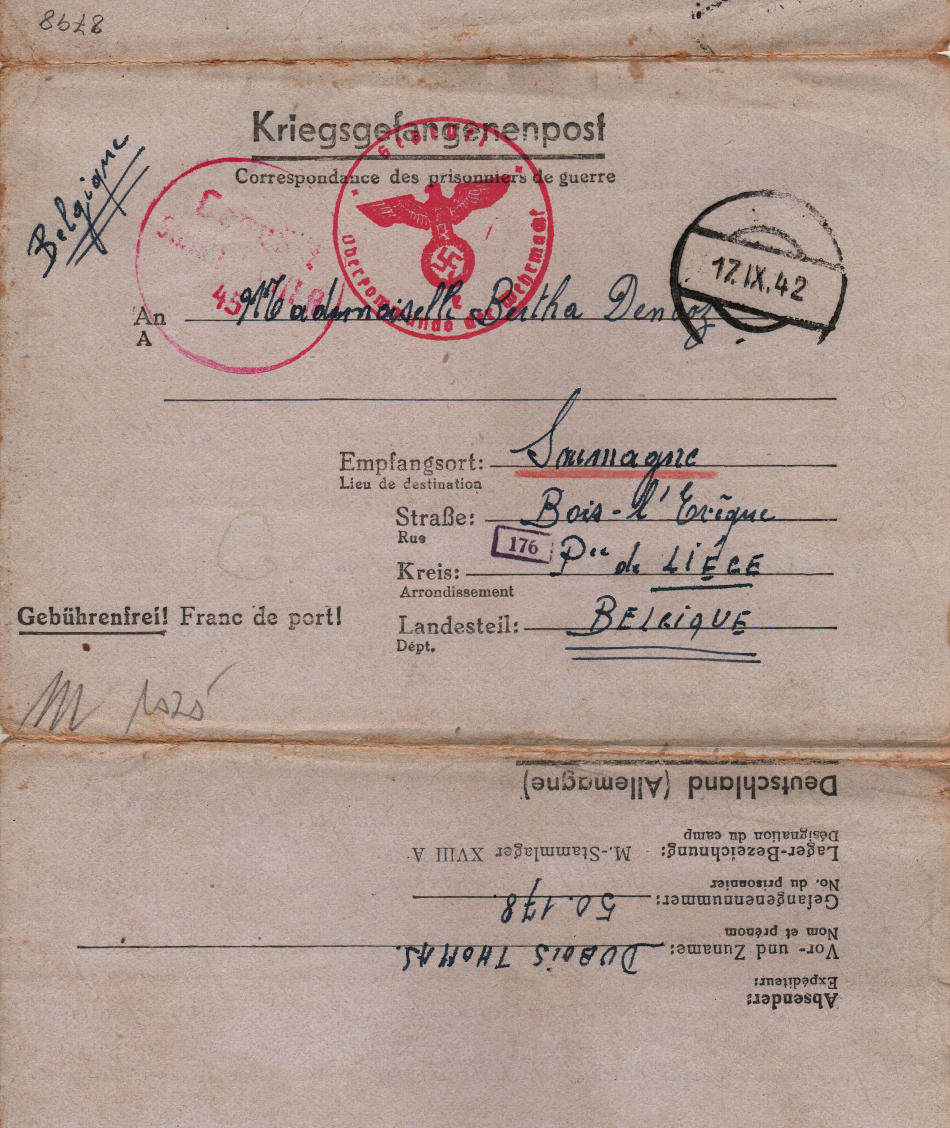 Lettera scritta il 6.9.1942 nel campo di prigionia e spedita a Soumagne (provincia di Liegi) in Belgio