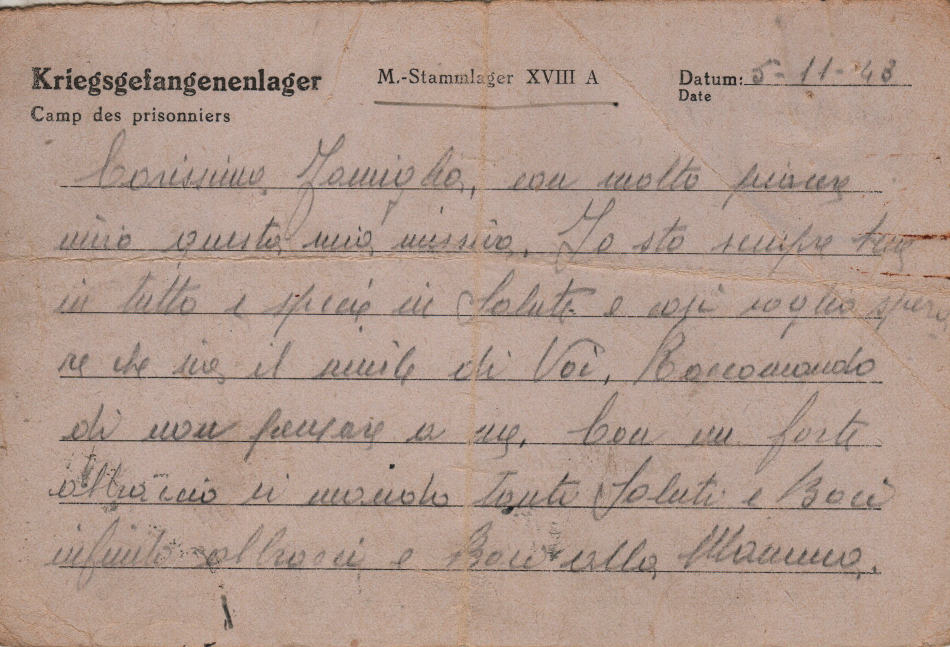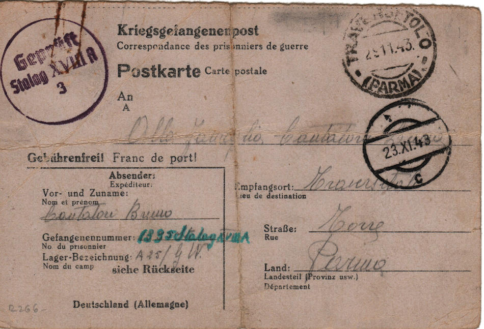 Cartolina scritta il 5.11.1943 dal campo di prigionia e spedita a Traversetolo (provincia di Parma) in Italia
