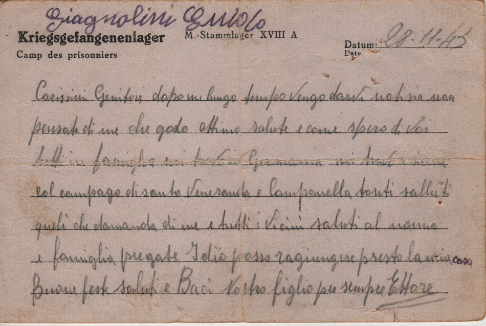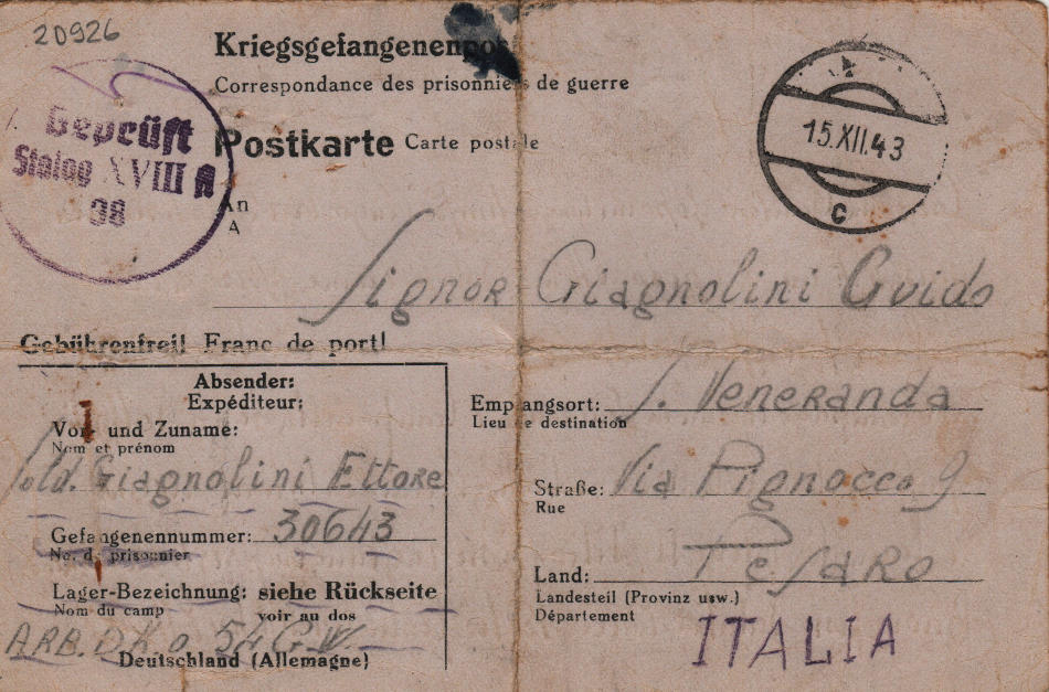Cartolina scritta il 28.11.1943 dal campo di prigionia e spedita a Santa Veneranda (Pesaro) in Italia