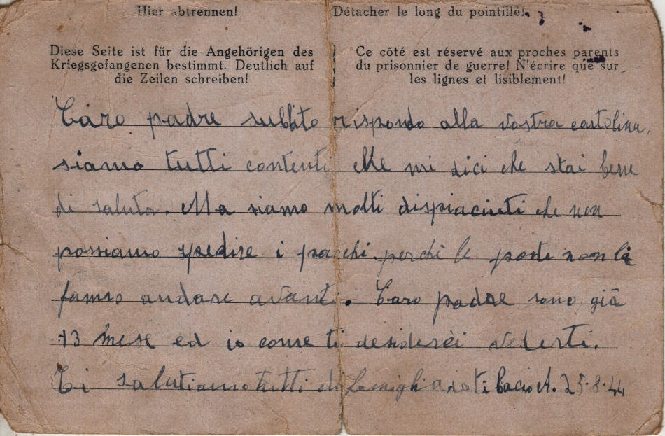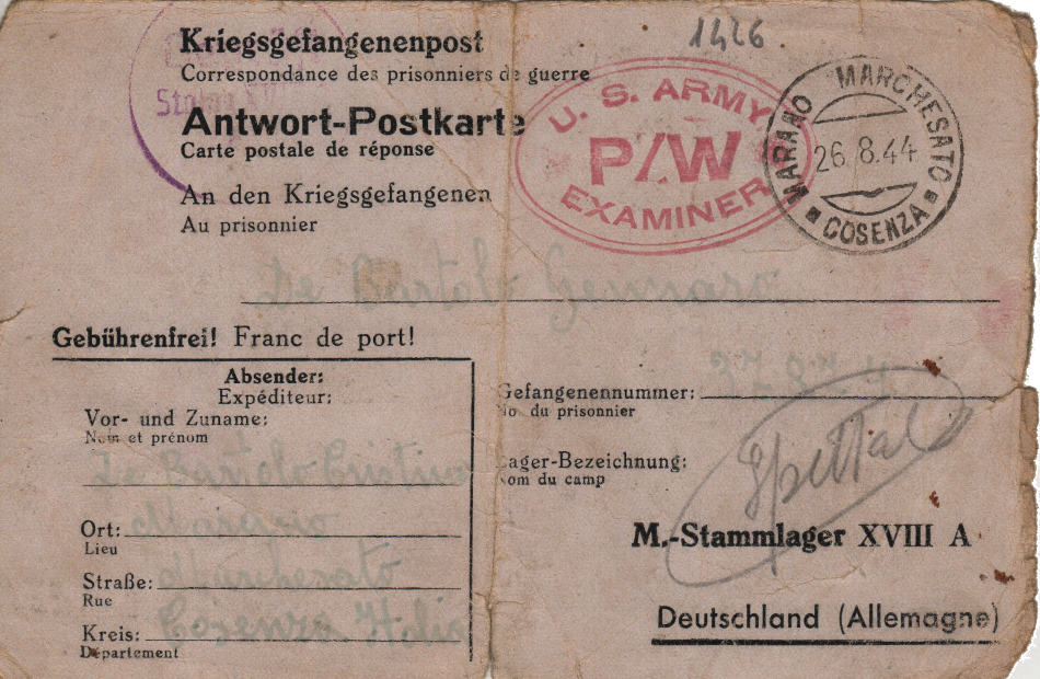 Cartolina scritta il 25.8.1944 a Marano Marchesato (provincia di Cosenza) in Italia e spedita al campo di prigionia