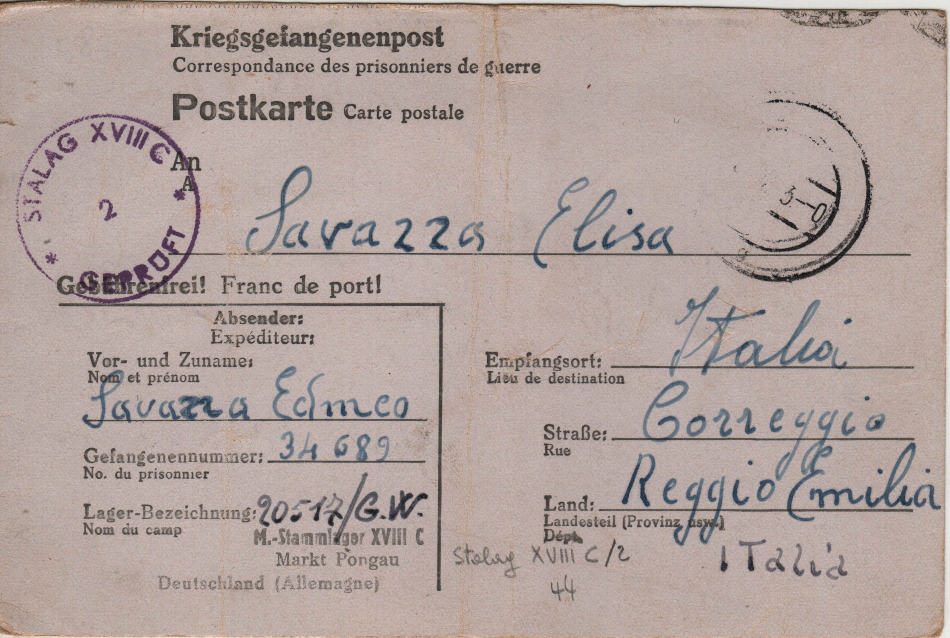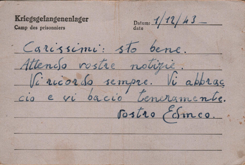Cartolina scritta il 1.12.1943 nel campo di prigionia e spedita a Correggio (provincia di Reggio Emilia) in Italia