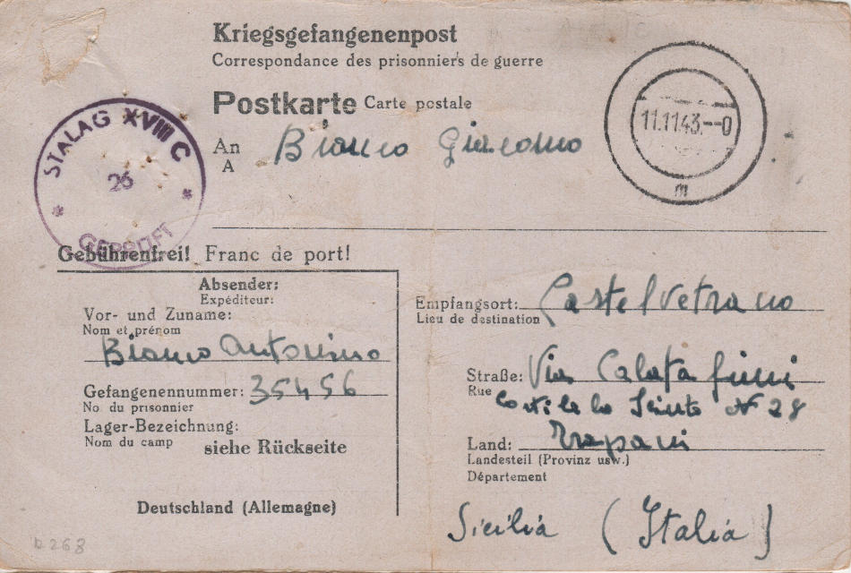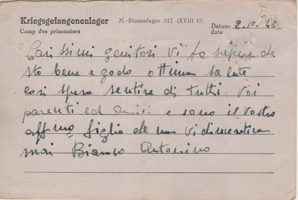 Cartolina scritta il 2.10.1943 nel campo di prigionia e spedita a Castelvetrano (provincia di Trapani) in Italia