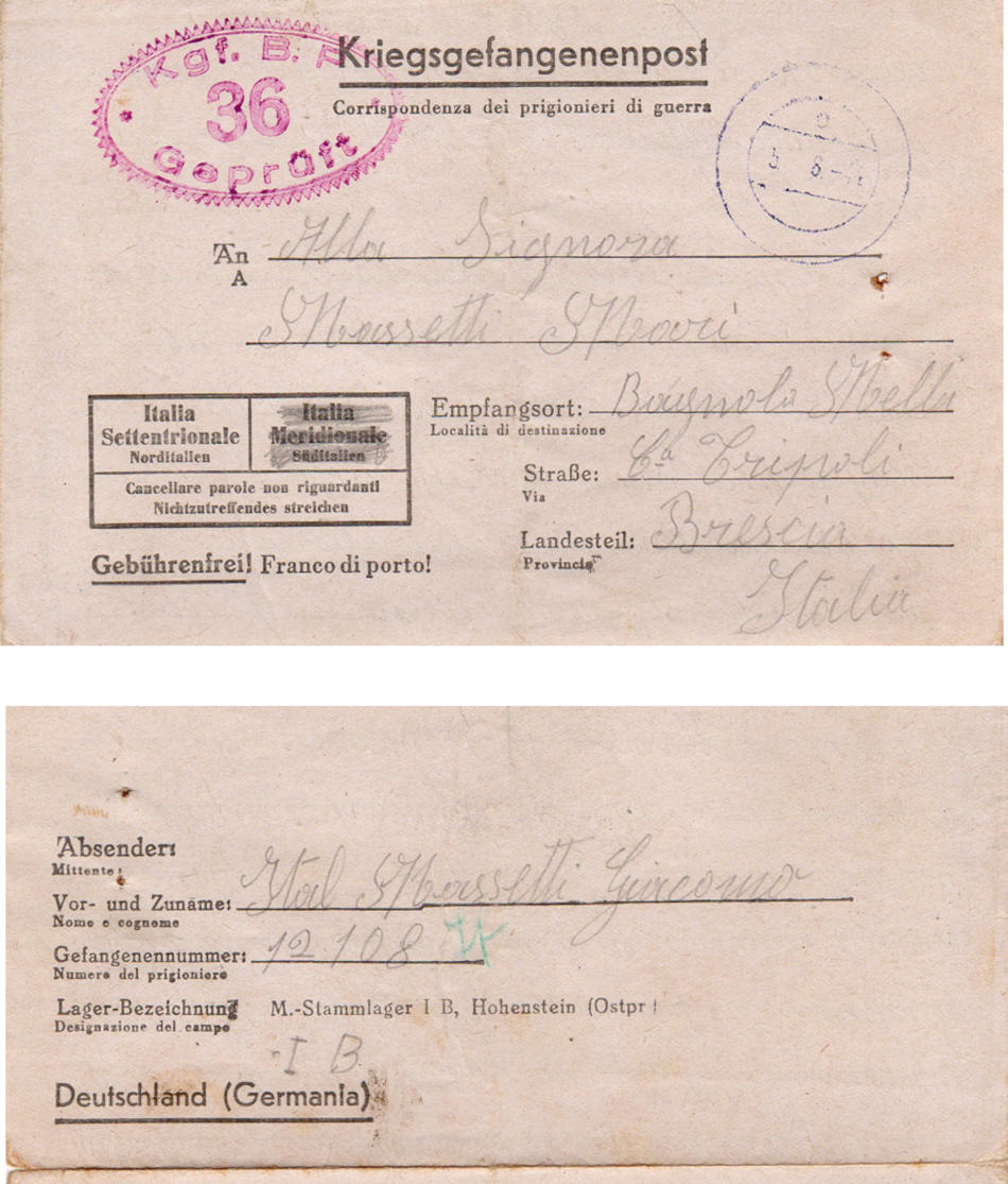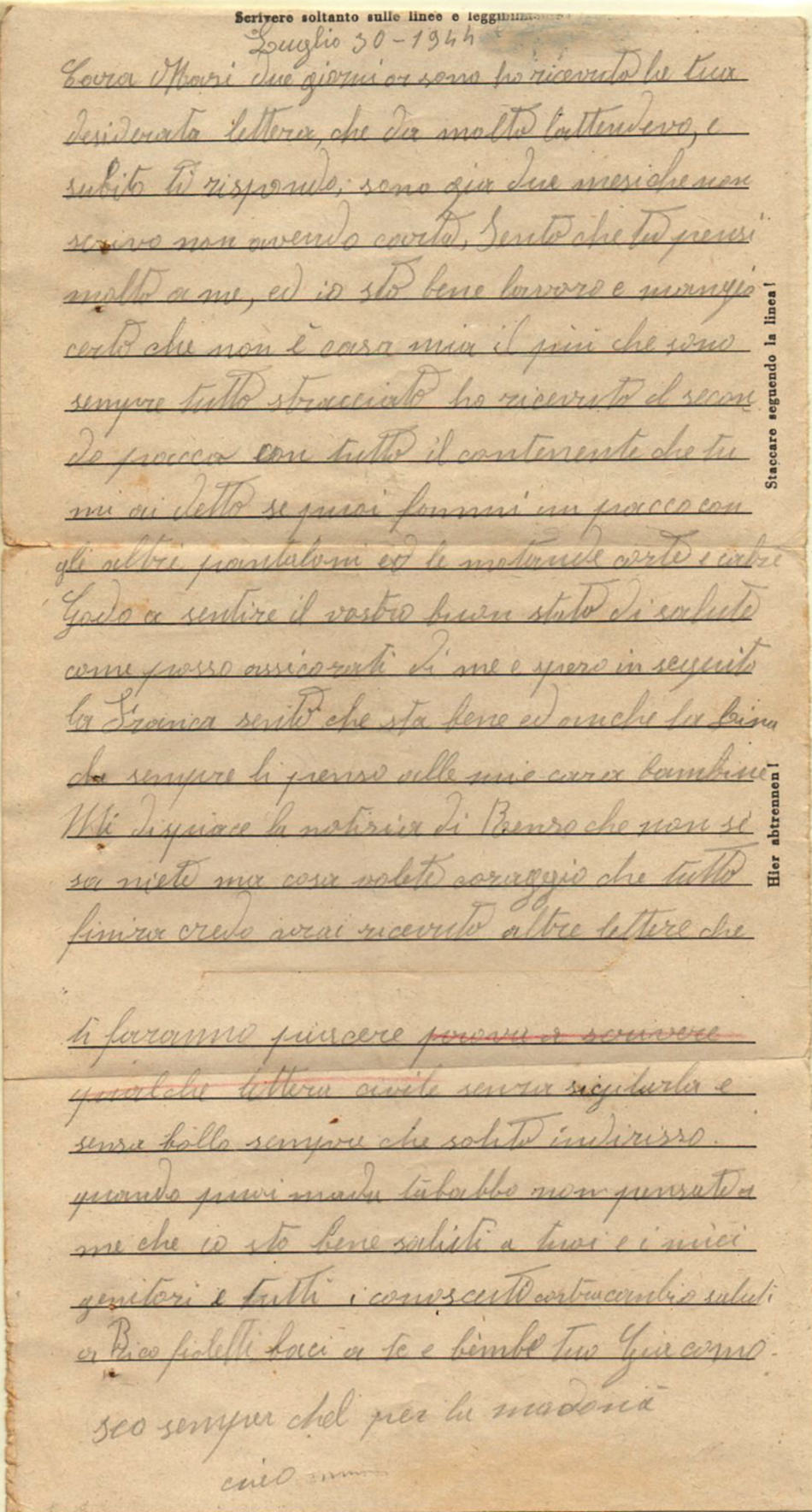Lettera scritta il 30.7.1944 nel campo di prigionia e spedita a Brescia (Italia)