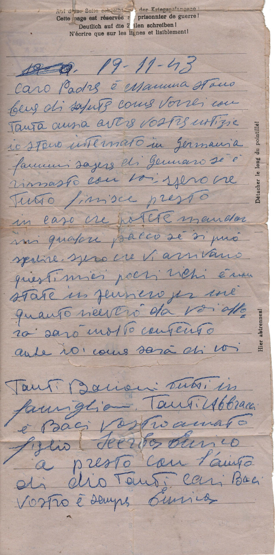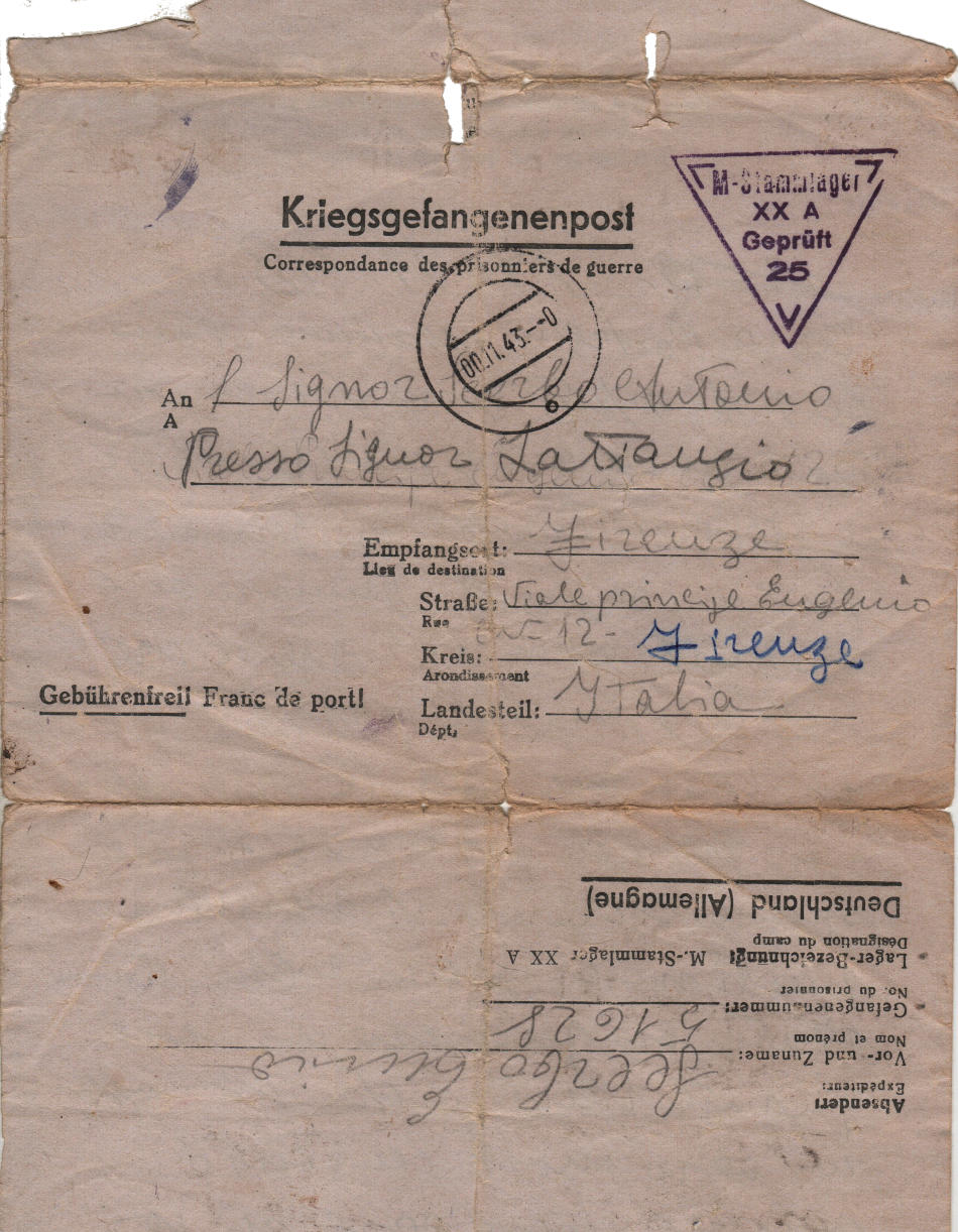 Lettera scritta il 19.11.1943 nel campo di prigionia e spedita a Firenze in Italia