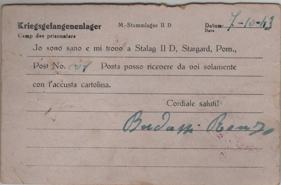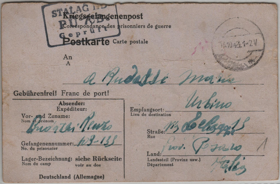 Cartolina precompilata scritta il 7.10.1943 nel campo di prigionia e spedita a Urbino, allora provincia di Pesaro e oggi di Pesaro e Urbino (Italia)