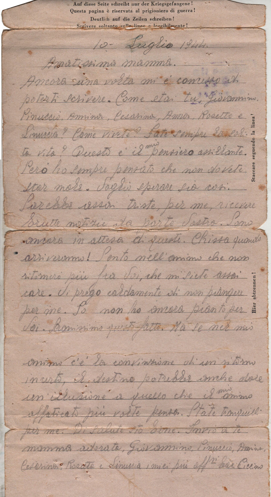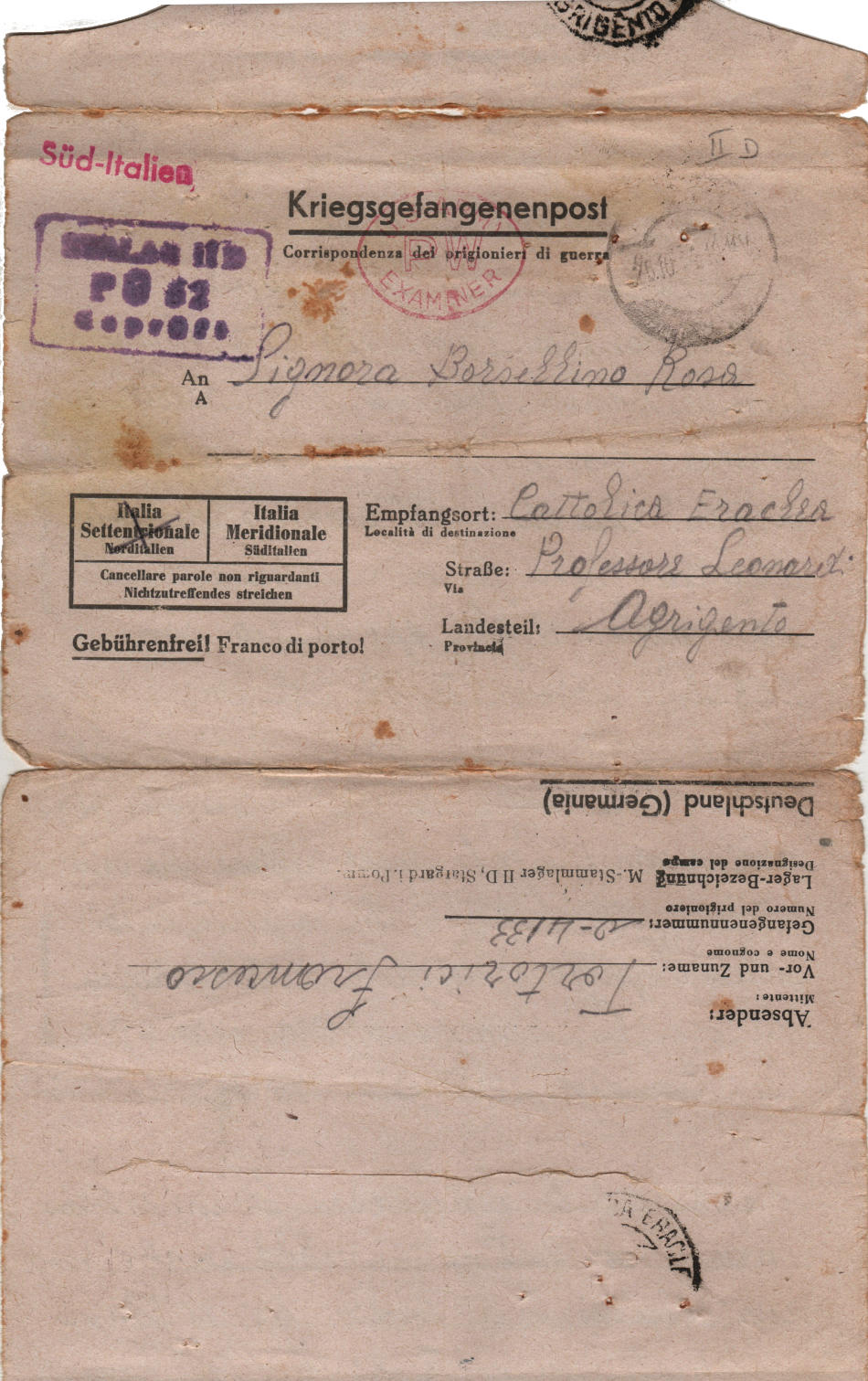 Lettera scritta il 10.7.1944 nel campo di prigionia e spedita a Cattolica Eraclea, in provincia di Agrigento (Italia)