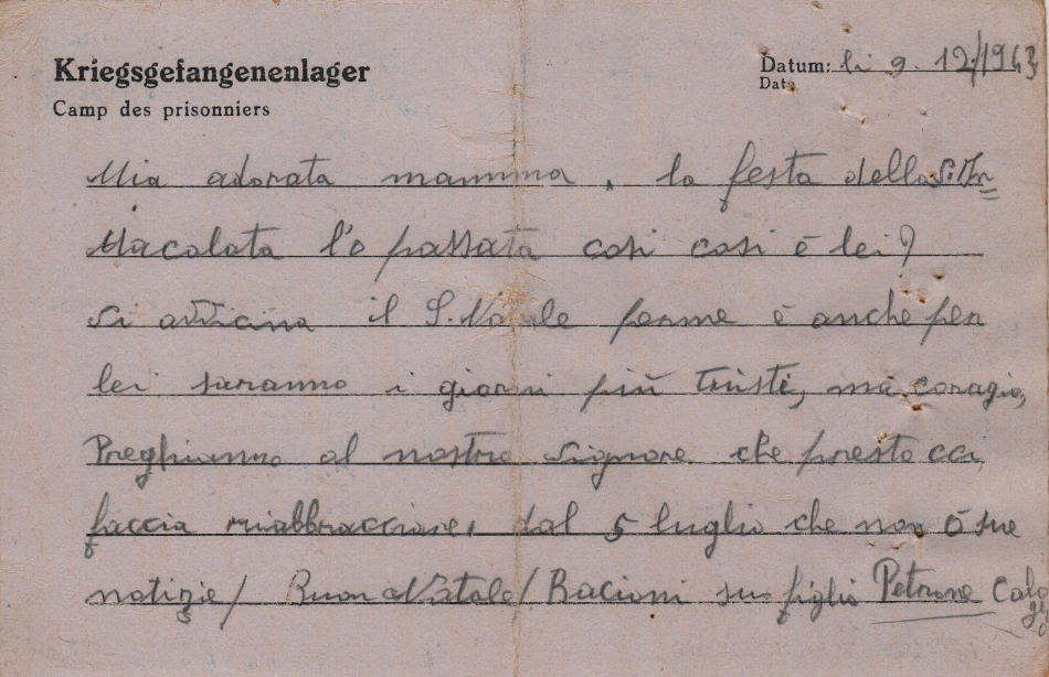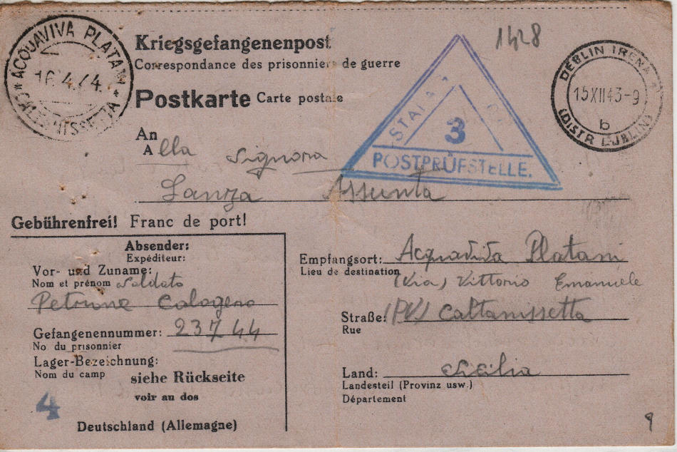 Cartolina scritta il 9.12.1943 nel campo di prigionia e spedita ad Acquaviva Platani, provincia di Caltanissetta (Italia)