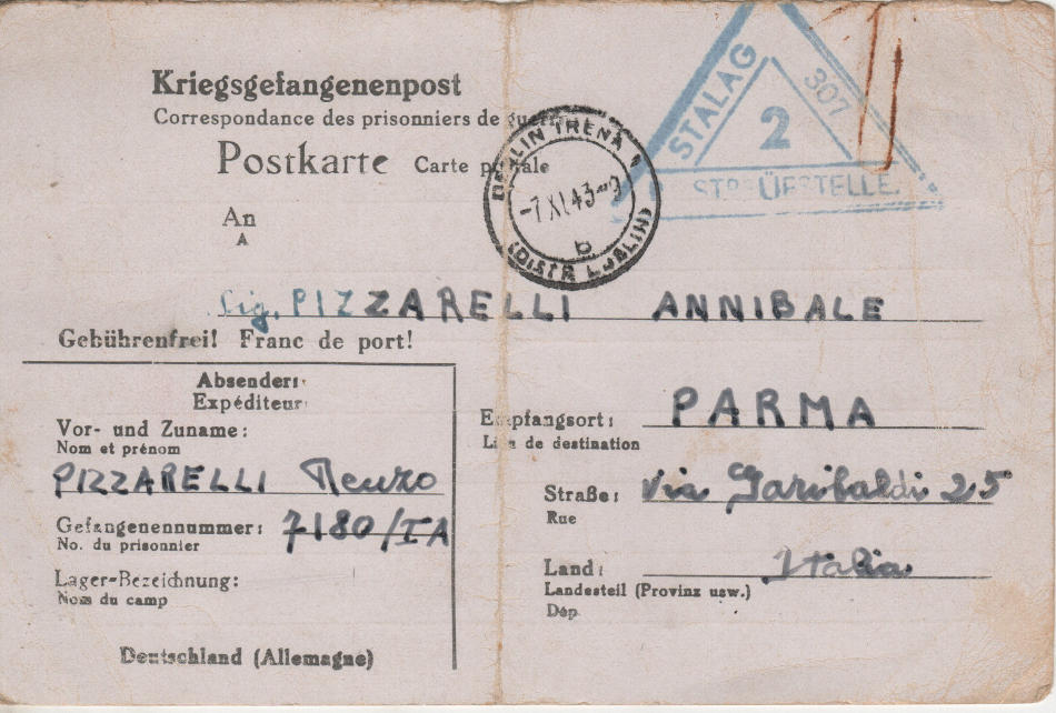Cartolina scritta il 1.11.1943 nel campo di prigionia e spedita a Parma in Italia