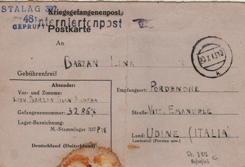 Cartolina scritta il 17.10.1943 nel campo di prigionia e spedita a Pordenone, allora provincia di Udine (Italia)