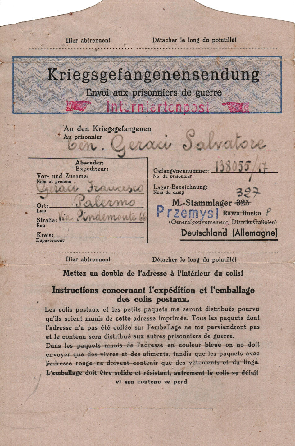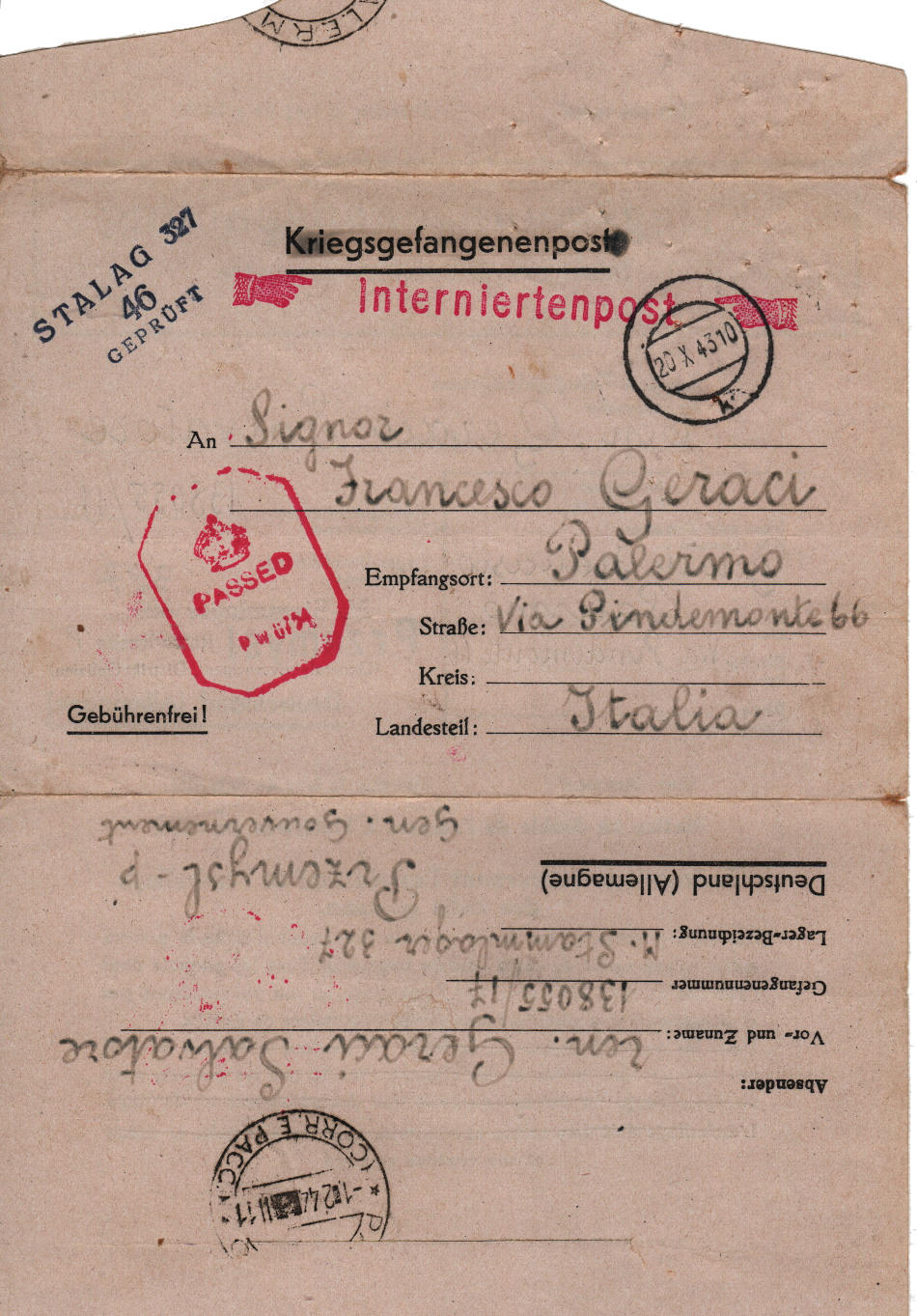 Lettera precompilata scritta il 23.10.1943 nel campo di prigionia e spedita a Palermo in Italia