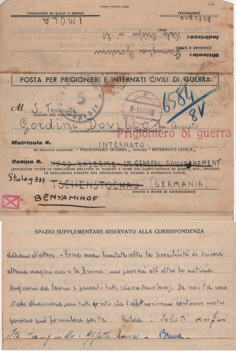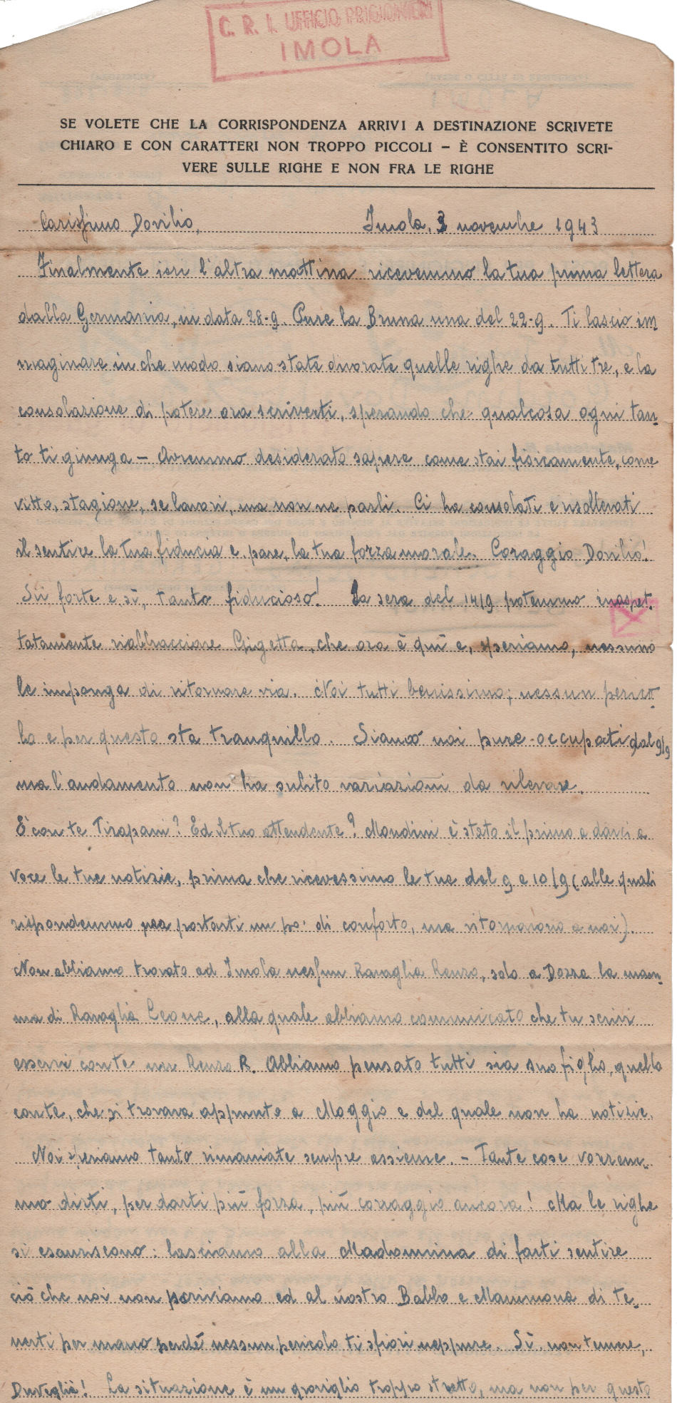 Lettera scritta il 3.11.1943 a Imola, provincia di Bologna (Italia) e spedita al campo di prigionia