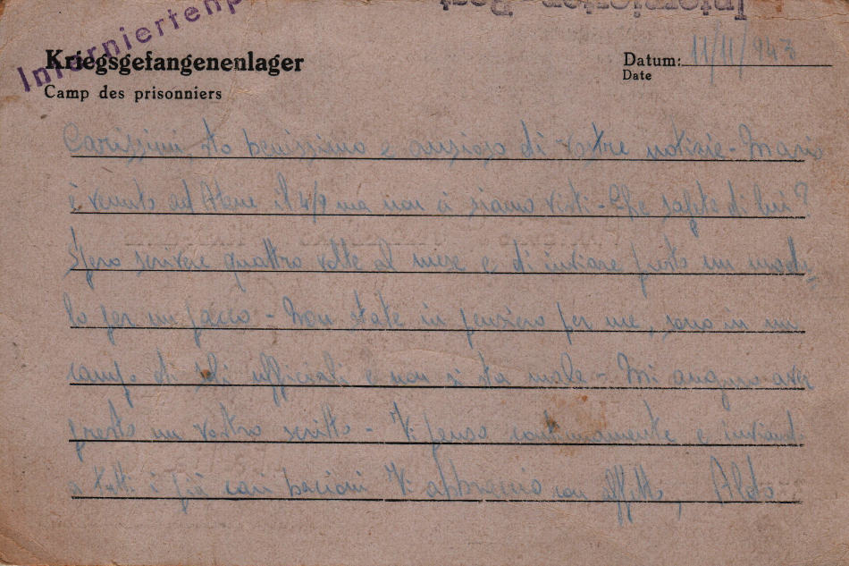Cartolina scritta l’ 11.11.1943 nel campo di prigionia e spedita a Palermo in Italia
