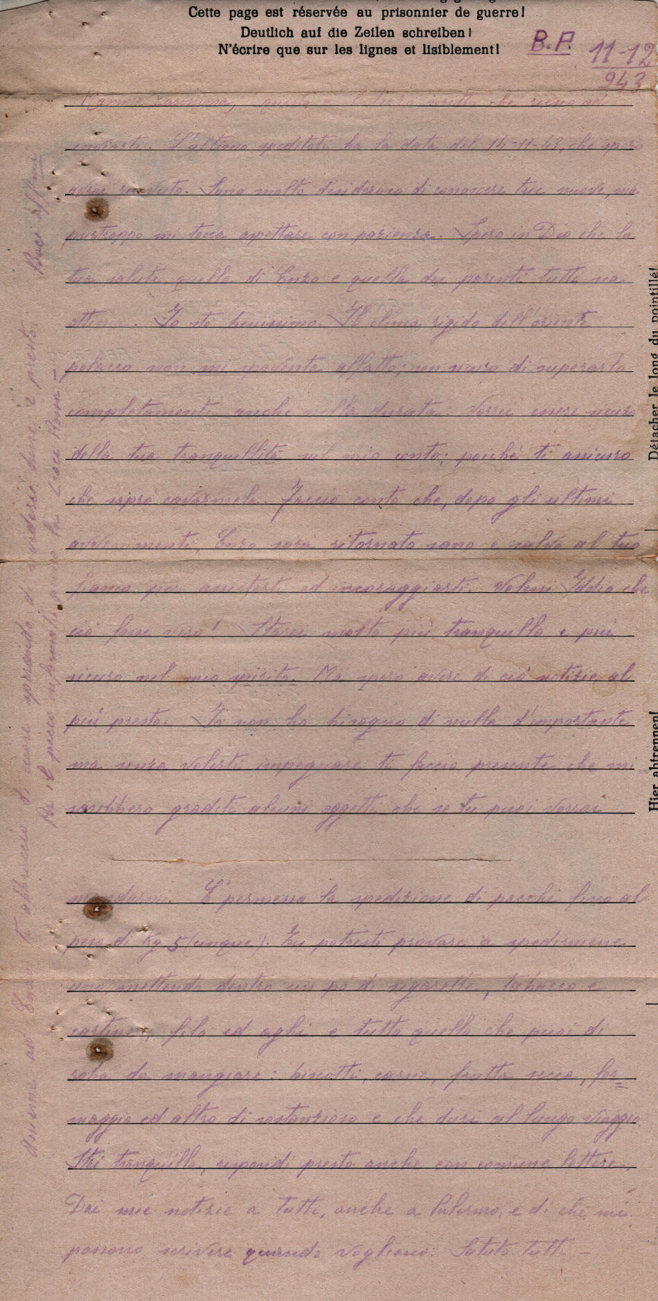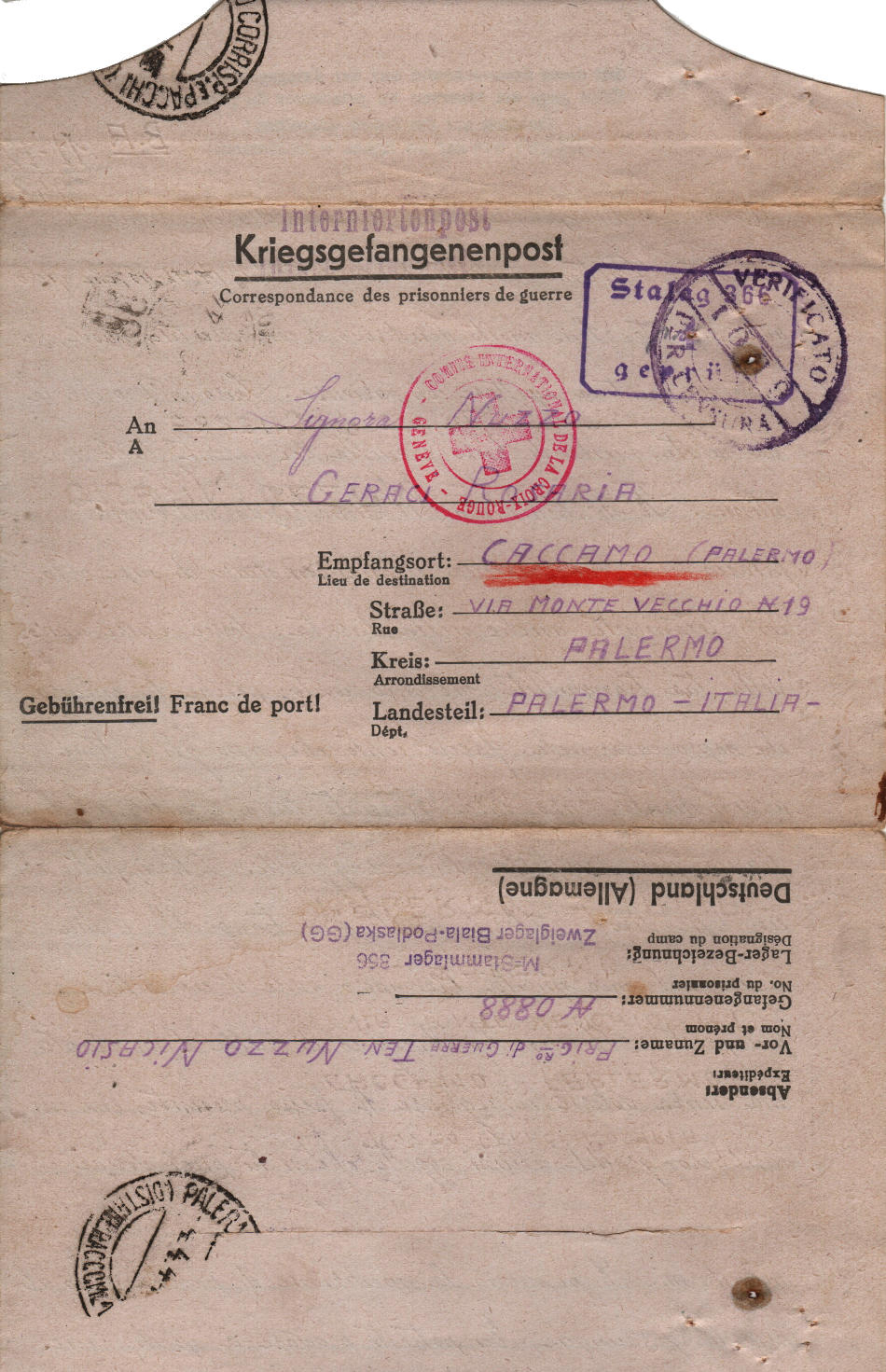 Lettera scritta l’ 11.12.1943 nel campo di prigionia e spedita a Caccamo (Palermo) in Italia