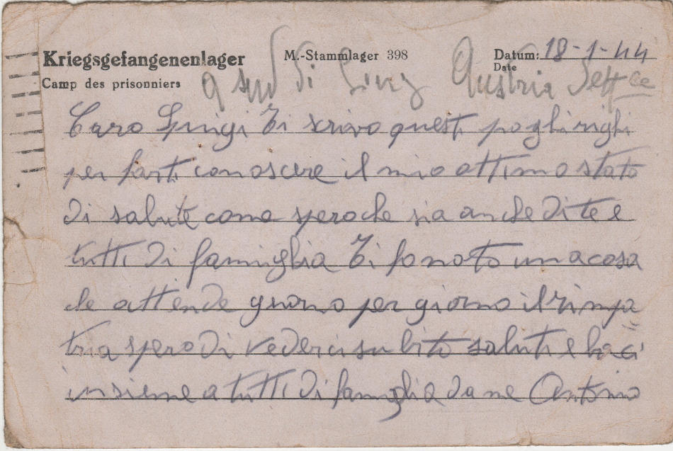 Cartolina scritta il 18.1.1944 nel campo di prigionia e spedita a Napoli in Italia