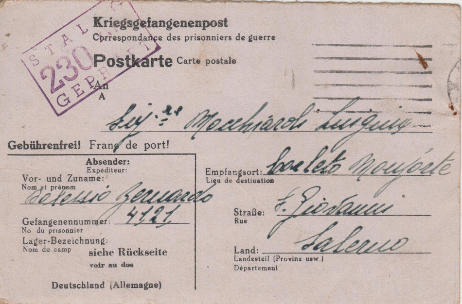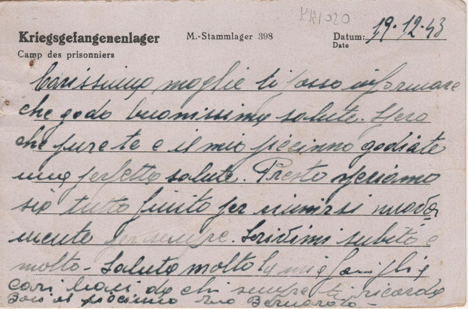 Cartolina scritta il 19.12.1943 nel campo di prigionia tedesco e spedita a Corleto Monforte (provincia di Salerno) in Italia