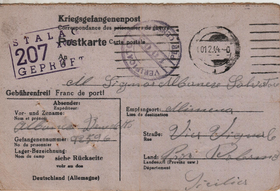 Cartolina scritta il 16.1.1944 nel campo di prigionia tedesco e spedita a Alimena (provincia di Palermo) in Italia