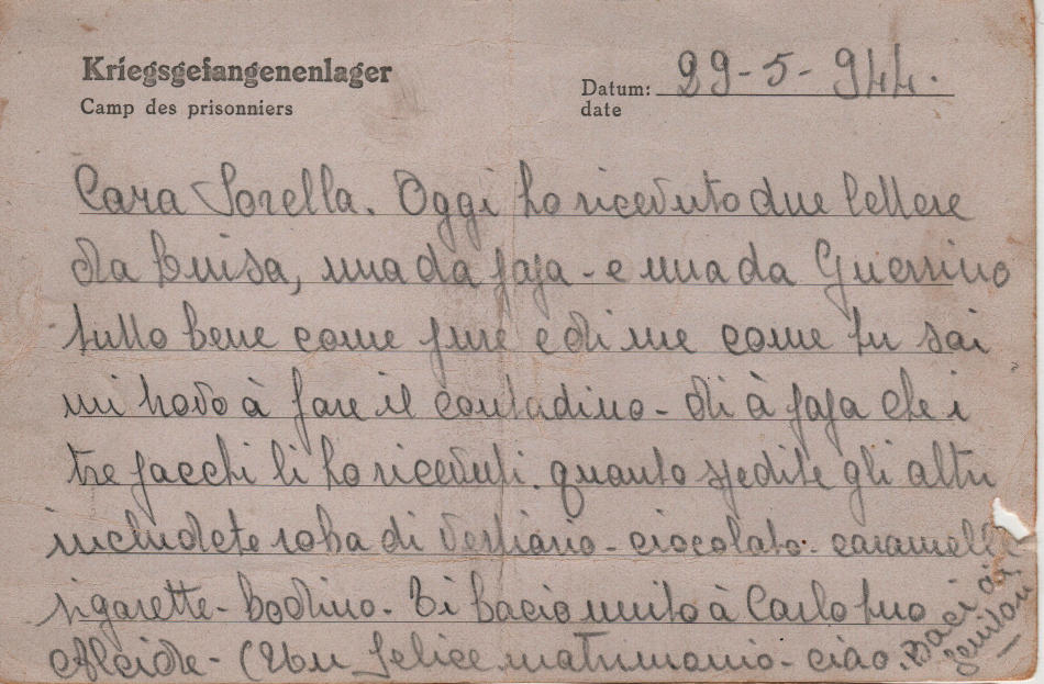 Cartolina scritta il 29.5.1944 nel campo di prigionia e spedita a Correggio (provincia di Reggio Emilia) in Italia