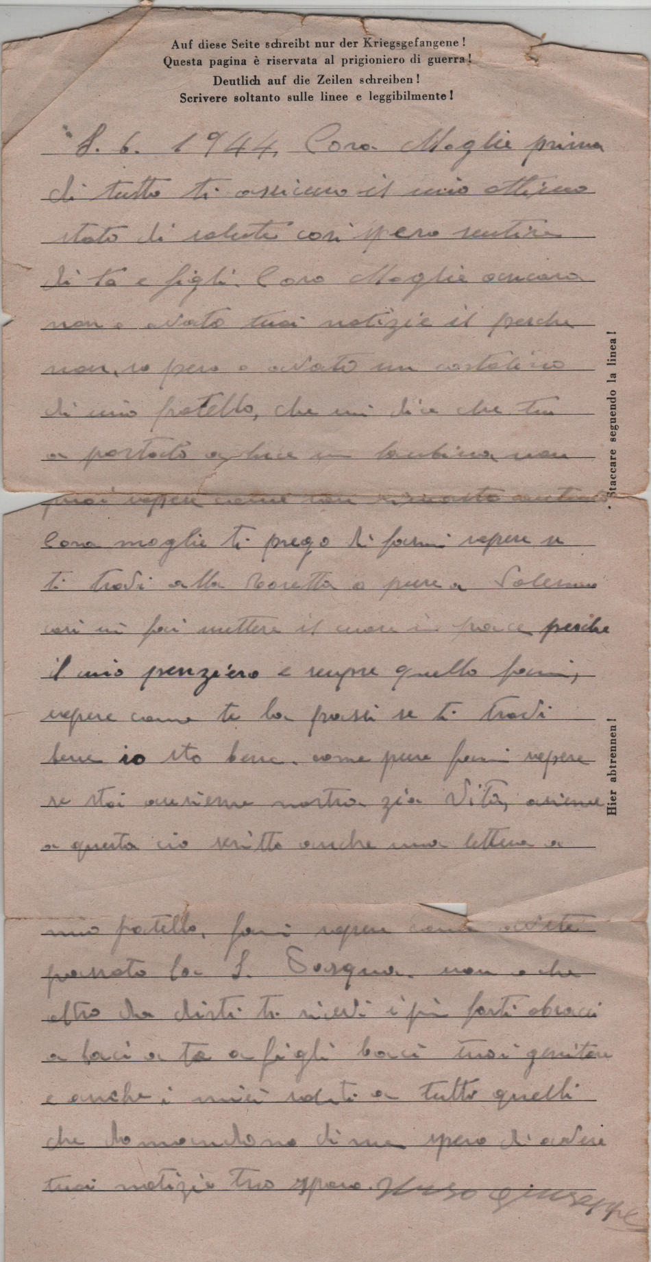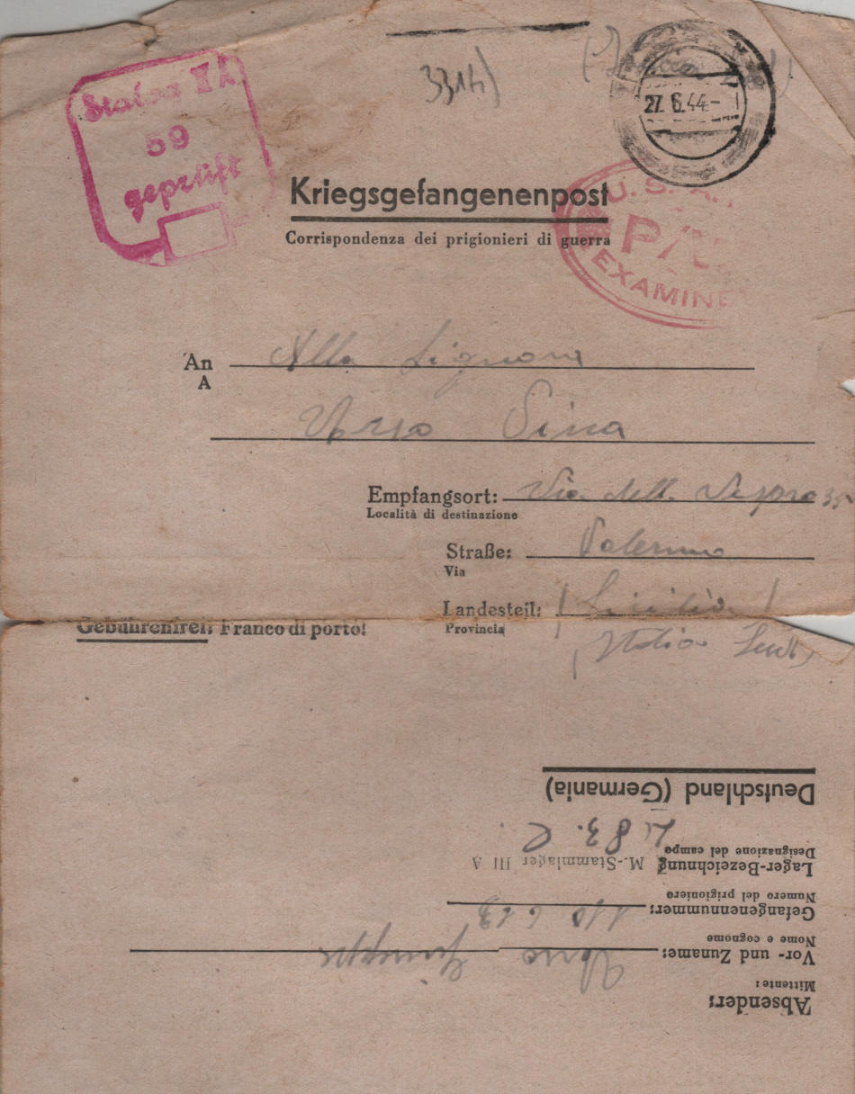 Lettera scritta l' 8.6.1944 nel campo di prigionia e spedita a Palermo in Italia