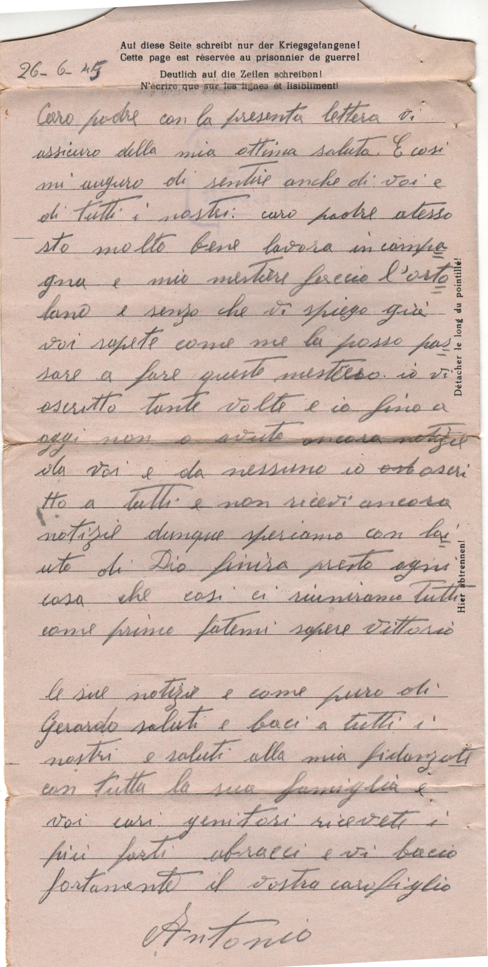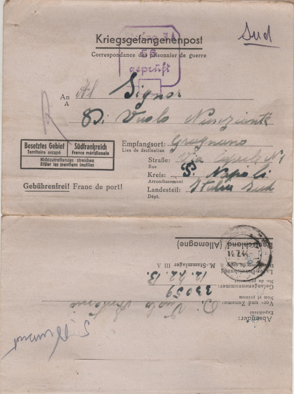 Cartolina scritta il 26.6.1944 nel campo di prigionia e spedita Gragnano, Napoli, in Italia
