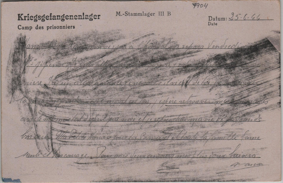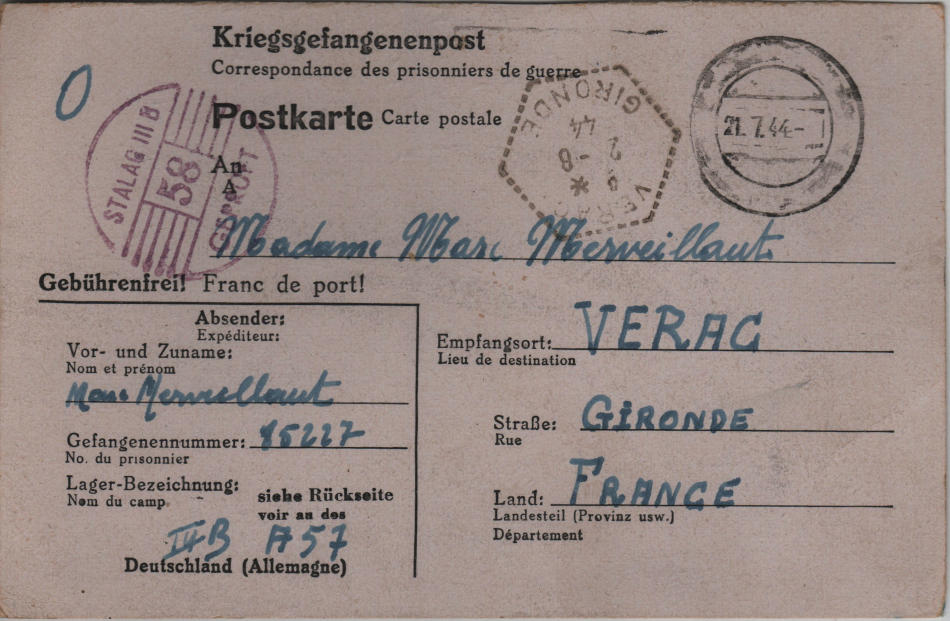 Cartolina scritta il 25.6.1944 nel campo di prigionia e spedita il 21.7.1944 a Verac, dipartimento Gironda (Francia)