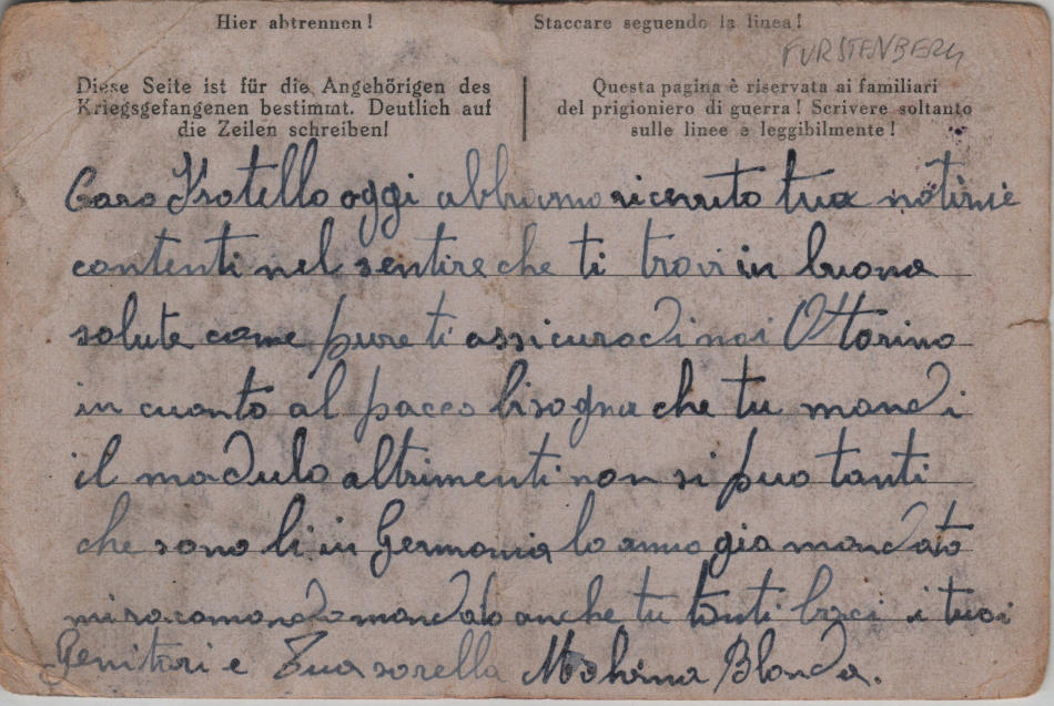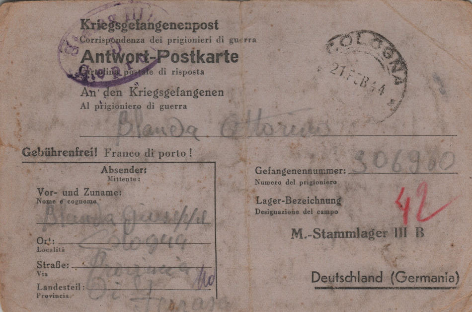 Cartolina scritta a Cologna, provincia di Ferrara (Italia) e spedita (data postale 21.2.1944) al campo di prigionia