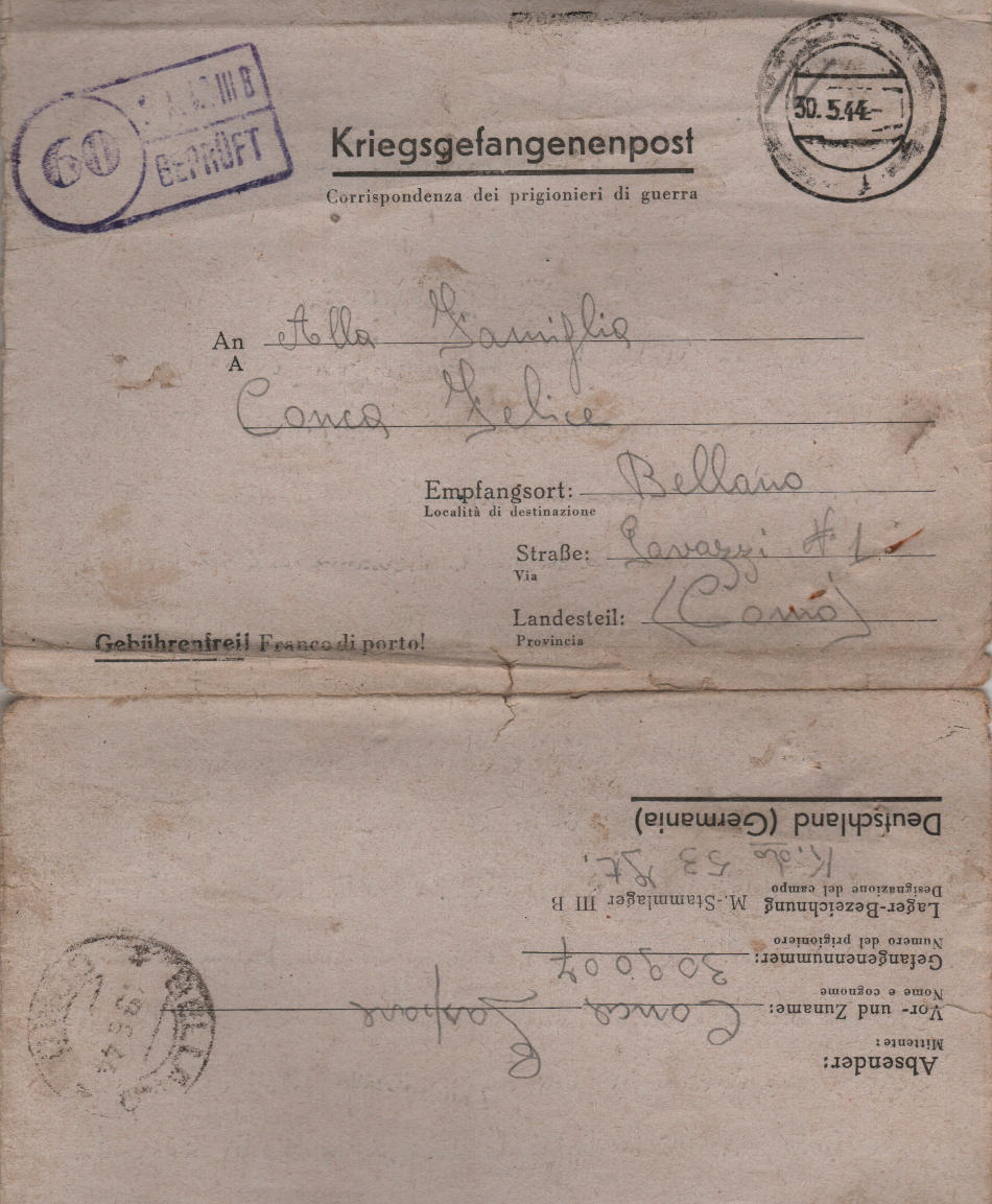 Lettera scritta il 12.3.1944 nel campo di prigionia e spedita a Bellano (allora provincia di Como) in Italia