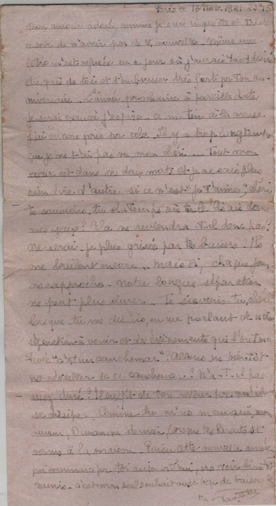 Lettera scritta il 18.11.1941 a Parigi (Francia) e spedita al campo di prigionia