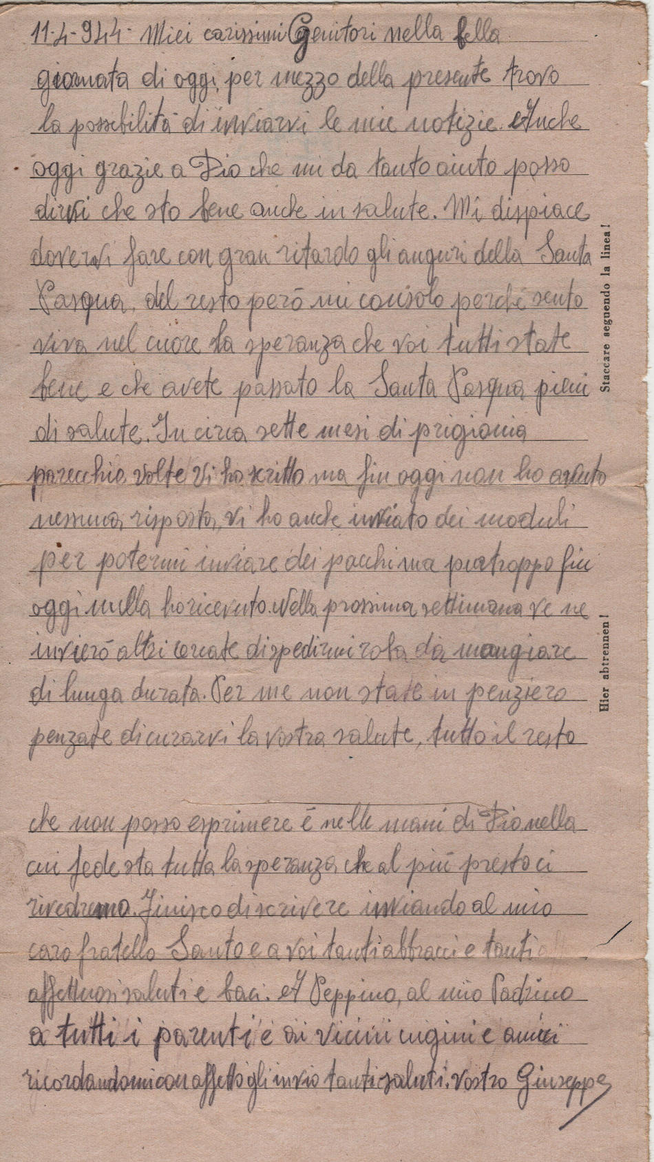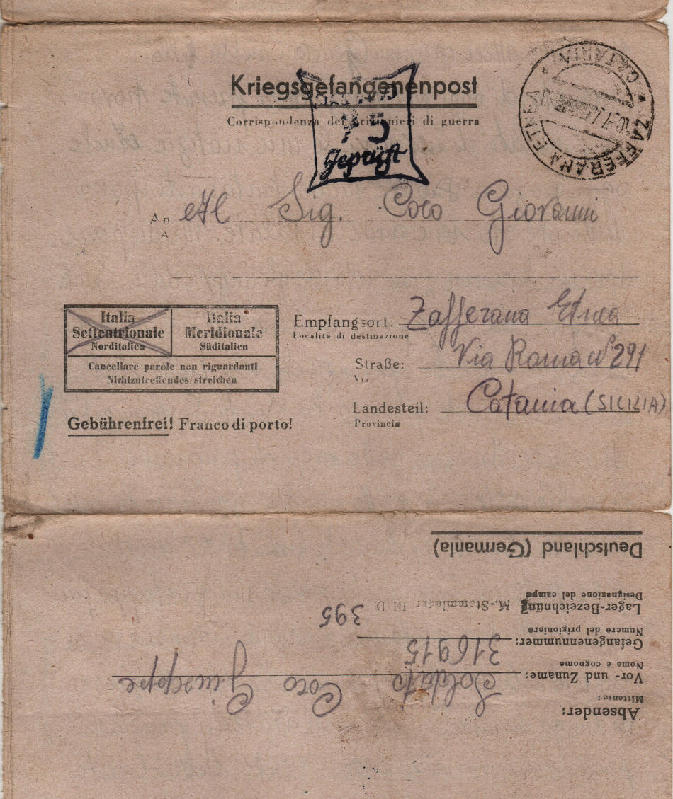 Lettera scritta l' 11.4.1944 nel campo di prigionia e spedita a Zafferana Etnea (provincia di Catania) in Italia