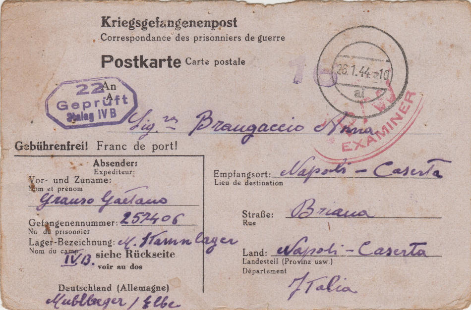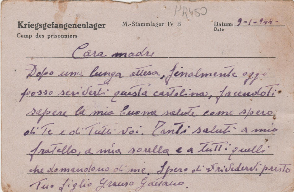 Cartolina scritta il 9.1.1944 nel campo di prigionia e spedita a Napoli – Caserta in Italia