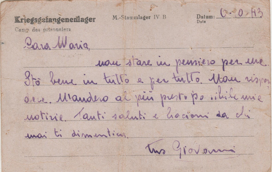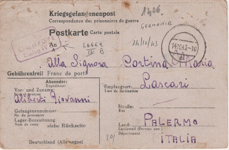 Cartolina scritta il 6.10.1943 nel campo di prigionia e spedita a Lascari, provincia di Palermo (Italia)