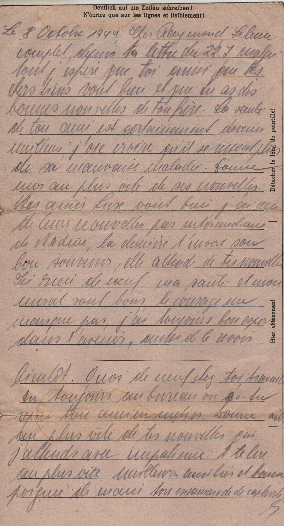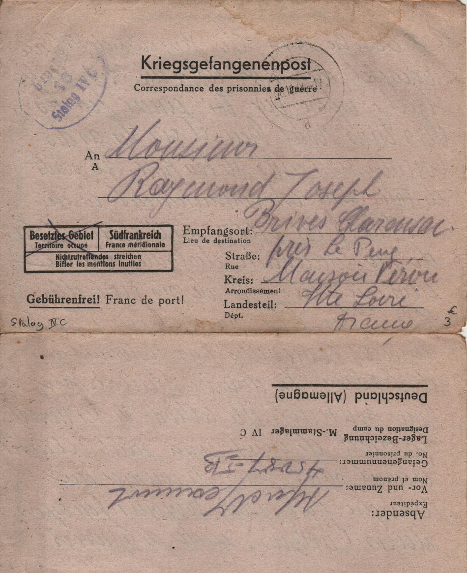 Lettera scritta l' 8.10.1944 nel campo di prigionia e spedita a Brives Charensac, in Alta Loira (Francia)