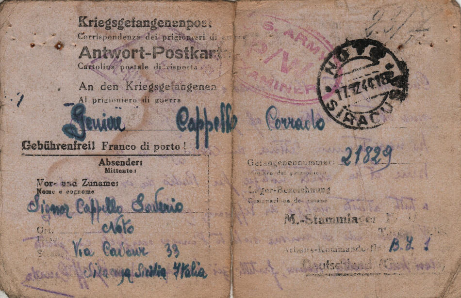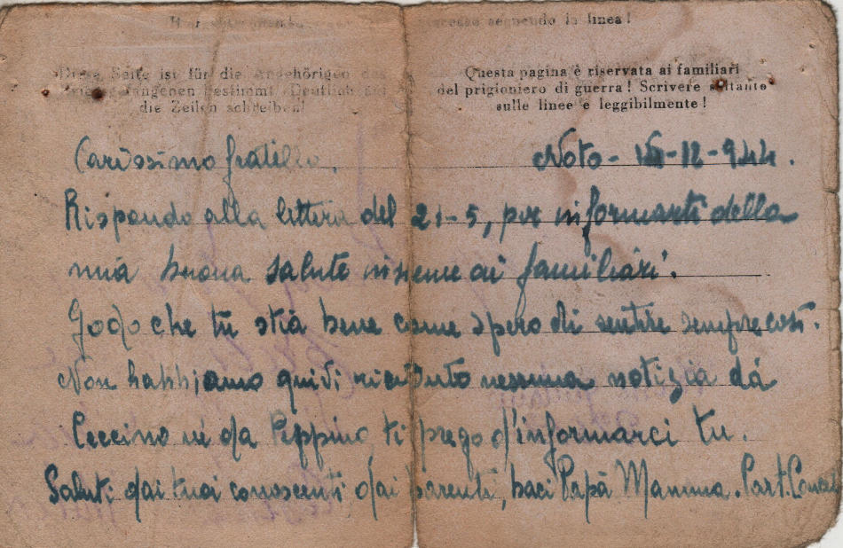 Cartolina scritta il 15.12.1944 a Noto, provincia di Siracusa (Italia) e spedita al campo di prigionia