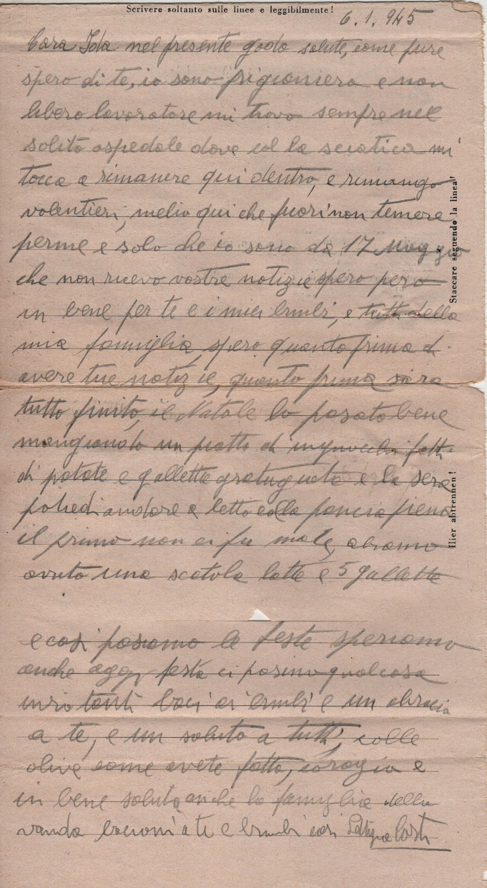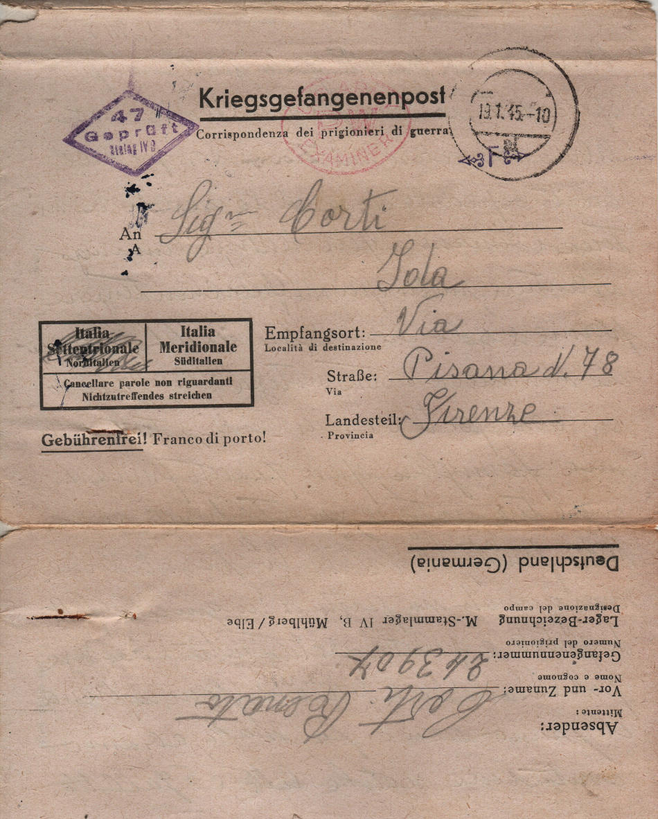 Lettera scritta il 6.1.1945 nel campo di prigionia e spedita a Firenze in Italia
