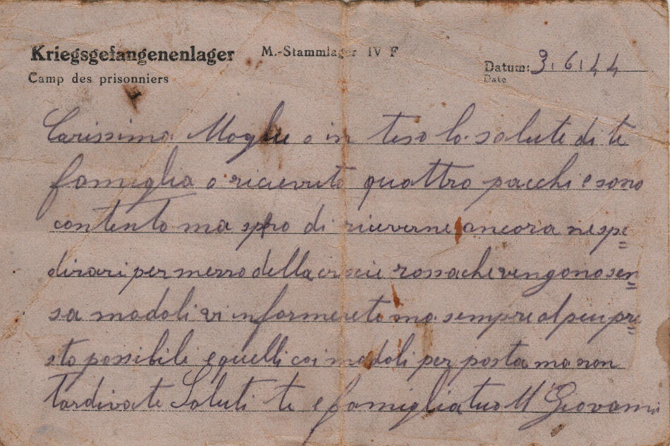 Cartolina scritta il 3.6.1944 nel campo di prigionia e spedita a Campo Tartano, provincia di Sondrio (Italia)