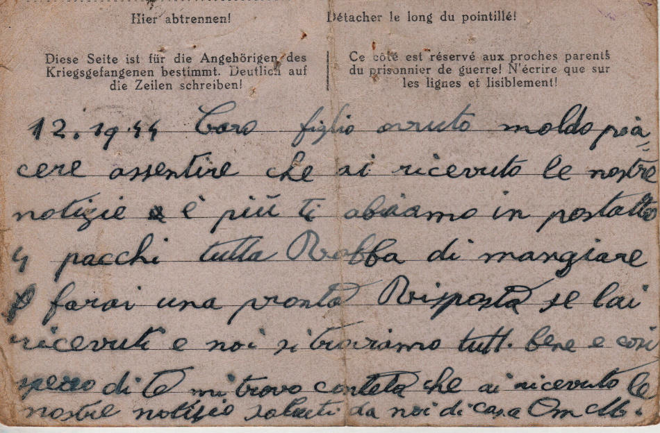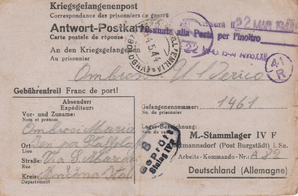 Cartolina scritta il 12.5.1944 a Staffolo, Jesi (provincia di Ancona) in Italia e spedita al campo di prigionia